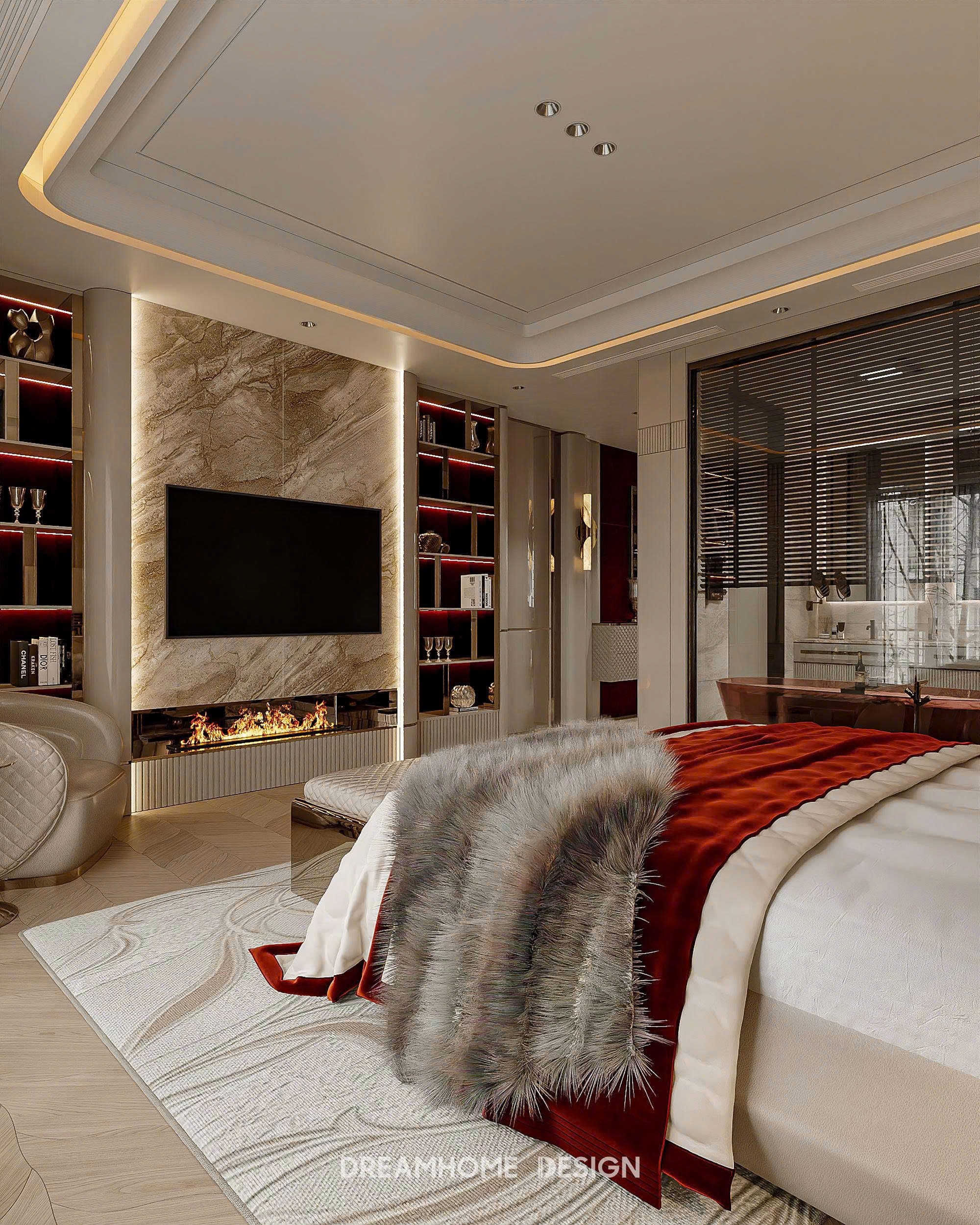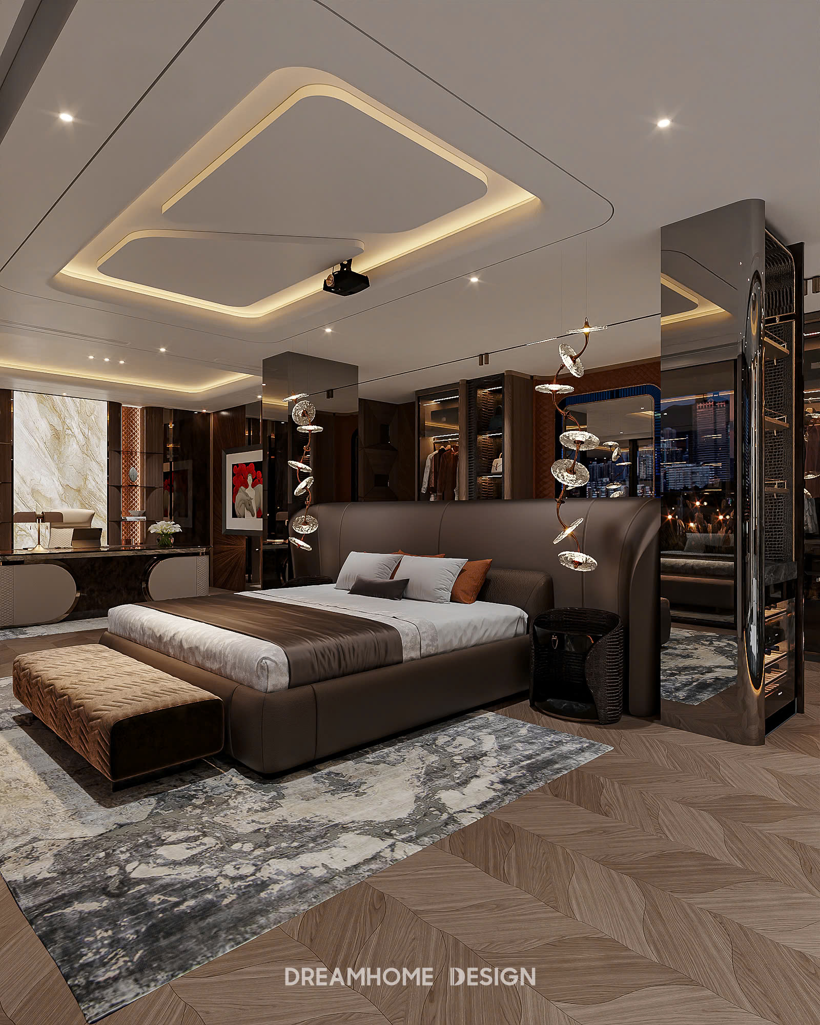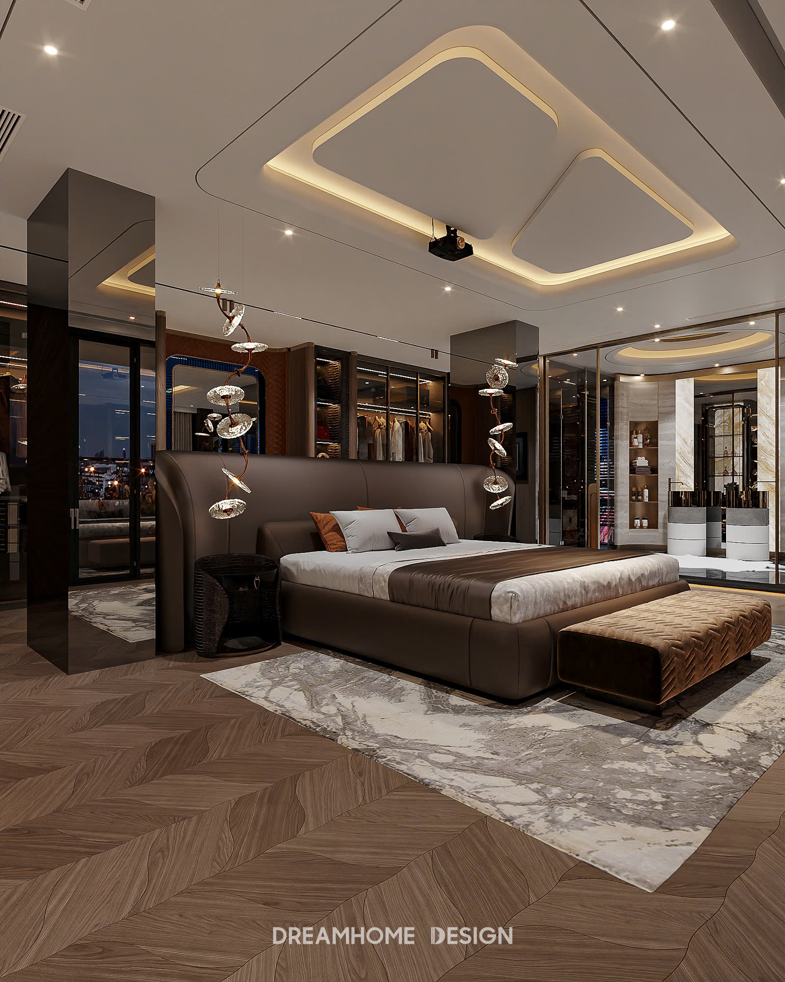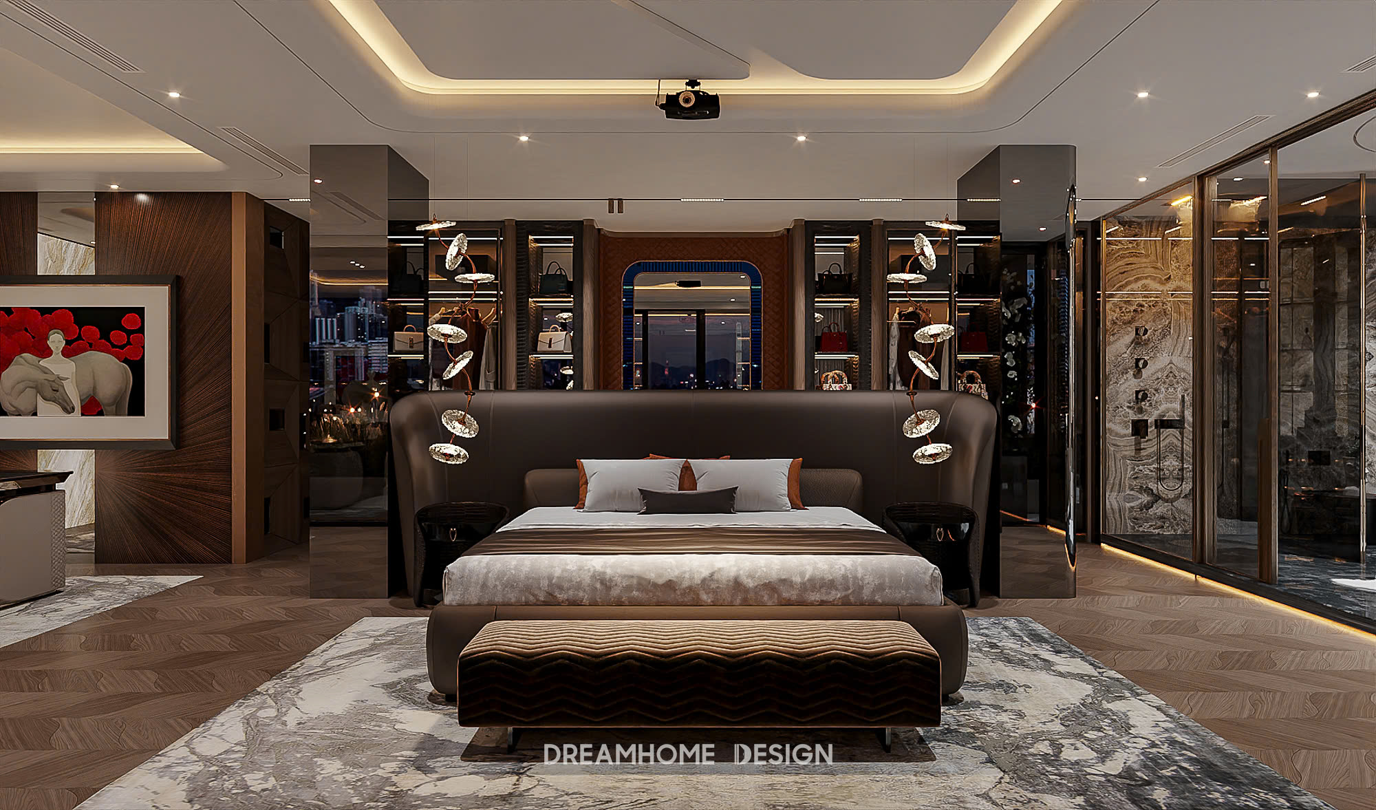 Không khí sang trọng của một phòng ngủ master thượng lưu còn đến từ sự tinh tế trong cách phối màu và bố cục. Tone màu trung tính như kem, be, trắng, nâu gỗ… luôn được ưu ái vì mang đến cảm giác yên bình và dễ chịu. Đường nét thiết kế gọn gàng, chỉn chu, hạn chế chi tiết thừa để không gian thoáng và sang theo đúng tinh thần “ít nhưng tinh”. Một vài điểm nhấn như tranh nghệ thuật, bình gốm, đèn trang trí hoặc một chiếc ghế thư giãn hướng ra cửa kính sẽ tạo nên cá tính riêng nhưng vẫn giữ được sự cân bằng tổng thể. Sự sang trọng trong phòng ngủ master không nằm ở việc phô diễn, mà là cảm giác “rất vừa đủ” – đủ tinh tế để đẹp, đủ yên bình để nghỉ ngơi, đủ sâu lắng để chạm đến cảm xúc.