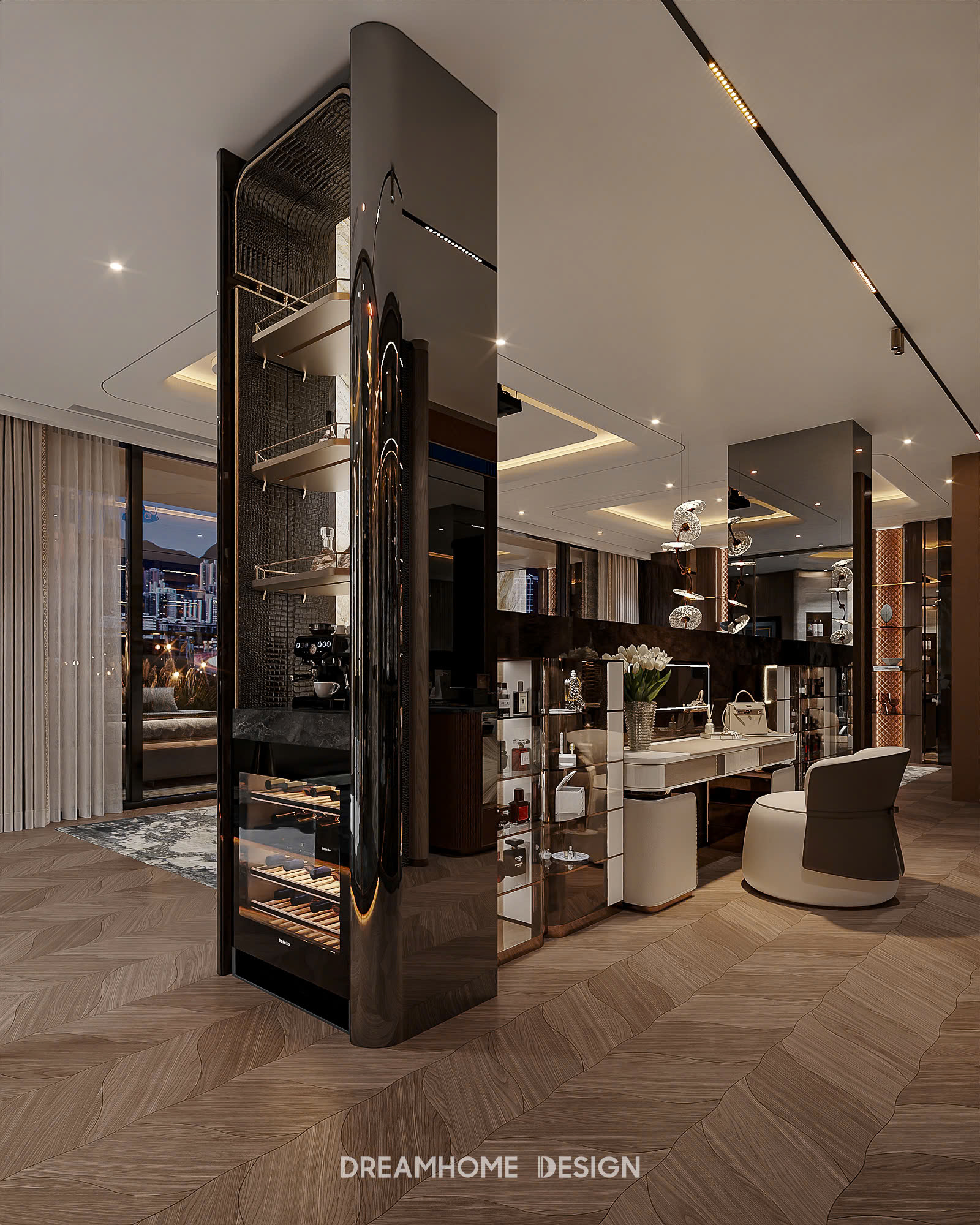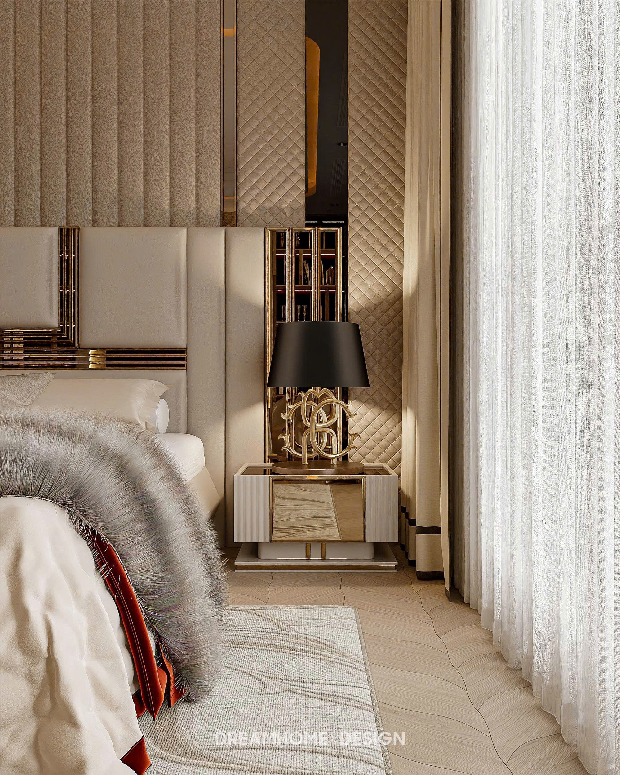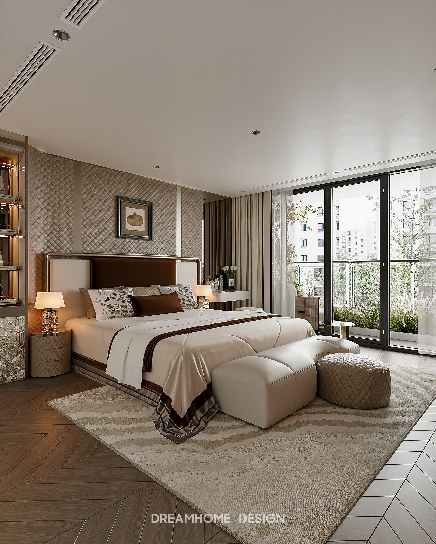 Rèm cửa làm từ linen hoặc cotton tạo cảm giác mềm mại, giúp không khí nhẹ nhàng hơn. Ngay cả chiếc thảm đặt dưới chân giường cũng được cân nhắc tỉ mỉ để khi bước xuống vào mỗi buổi sáng, đôi chân không bị lạnh mà chạm vào một bề mặt êm ái. Từng chất liệu đều góp phần tạo nên một trải nghiệm sống đẳng cấp – nơi bạn cảm nhận sự sang trọng không chỉ bằng mắt, mà bằng cả xúc giác.