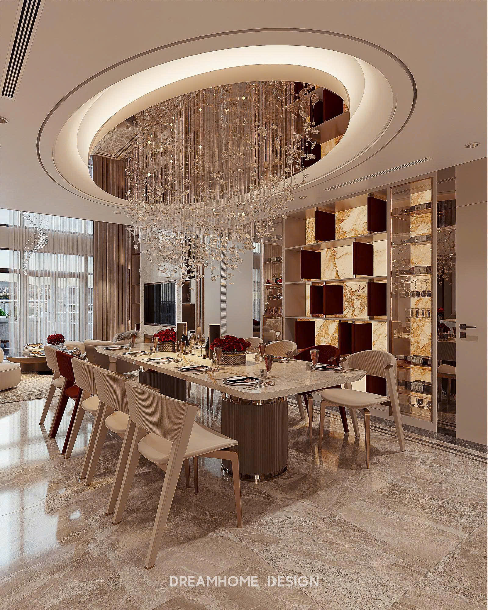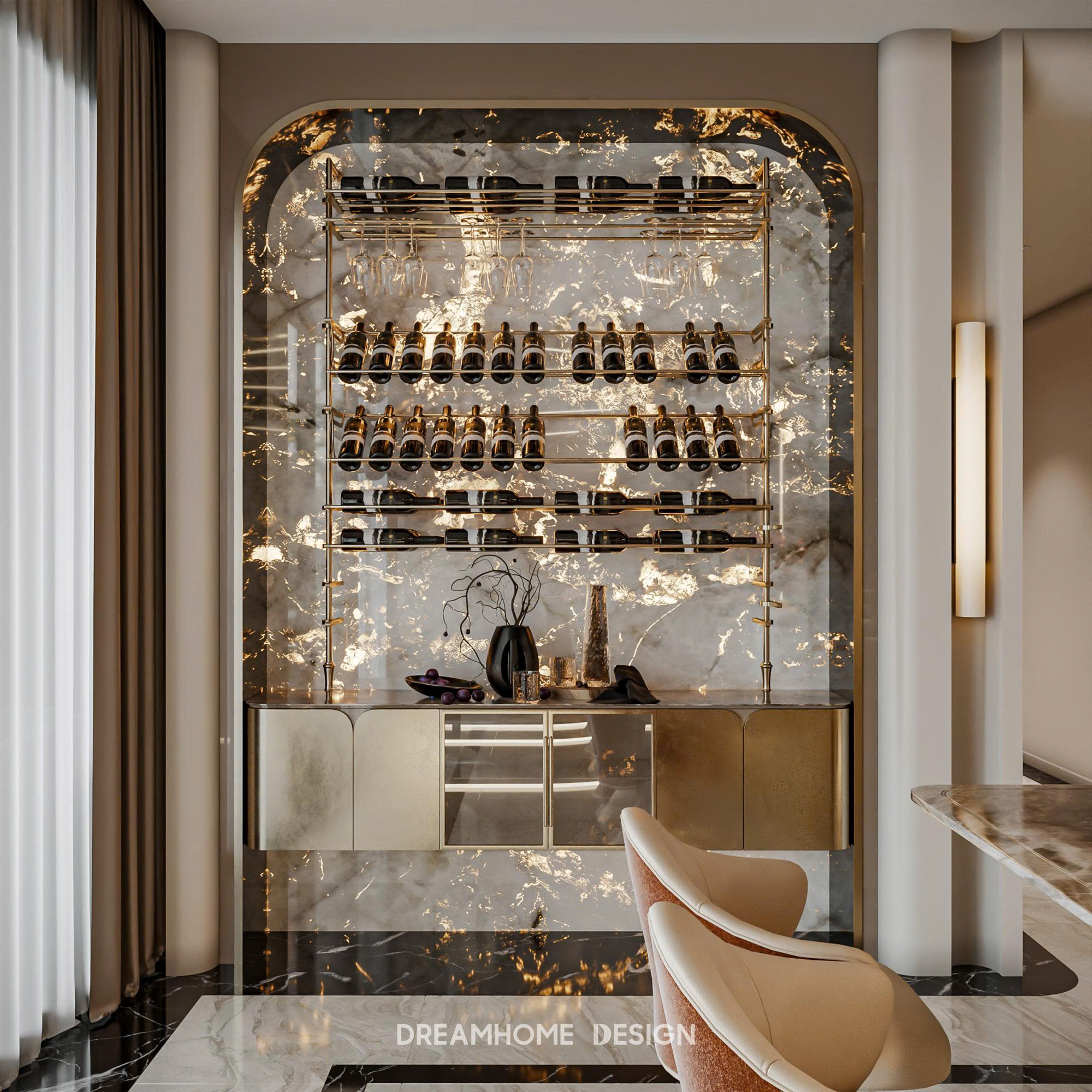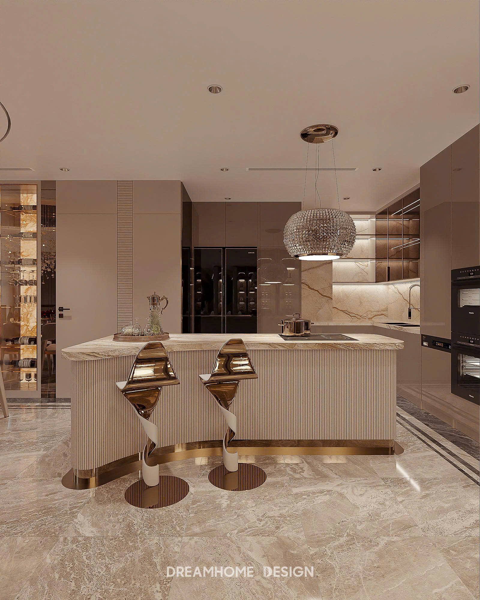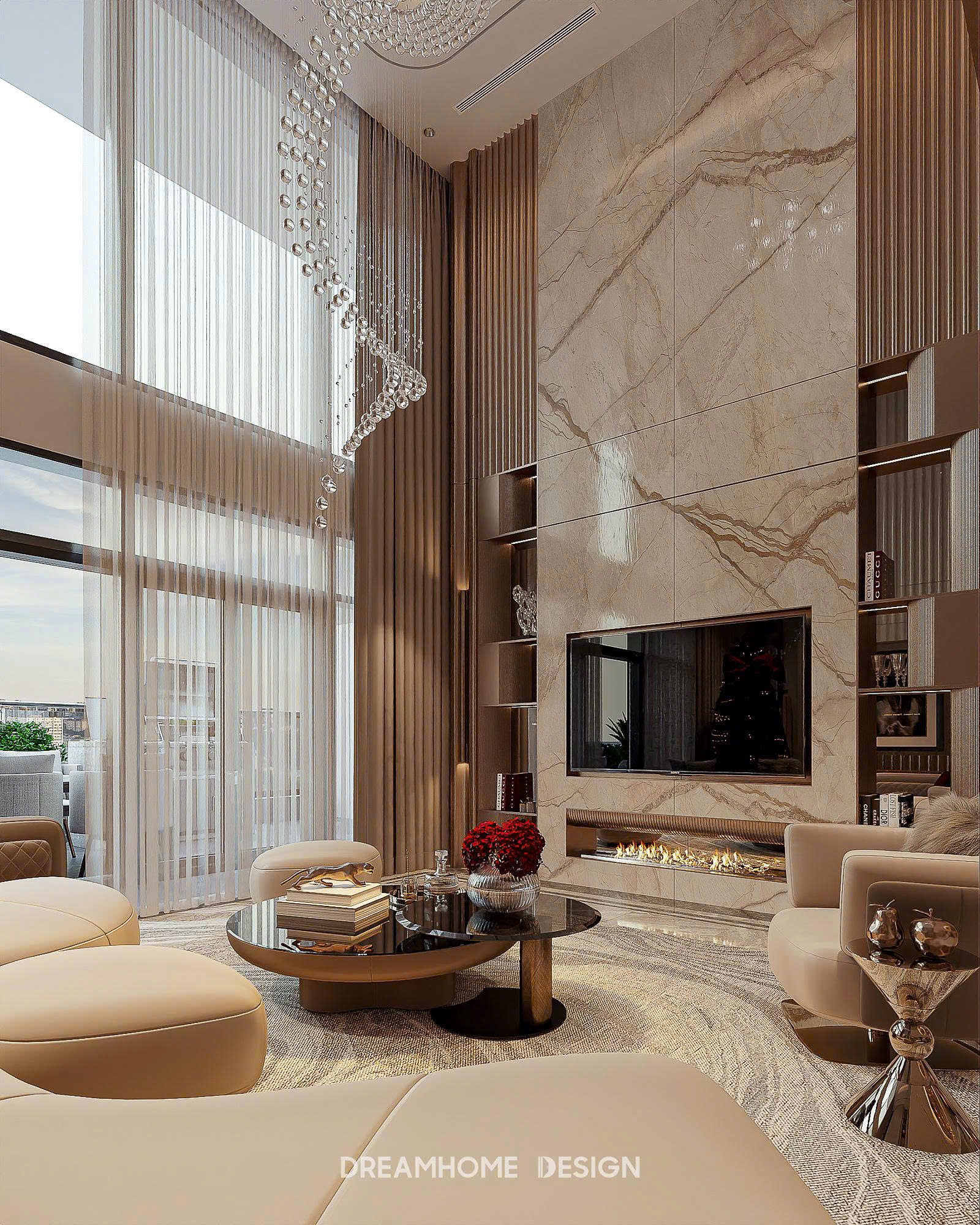 Đá tự nhiên, gỗ veneer, kim loại mạ, kính và da cao cấp là những vật liệu chủ đạo. Sự kết hợp hài hòa giữa bề mặt thô mộc và chi tiết tinh xảo tạo nên chiều sâu cho không gian, đồng thời tôn lên đẳng cấp sống của gia chủ.