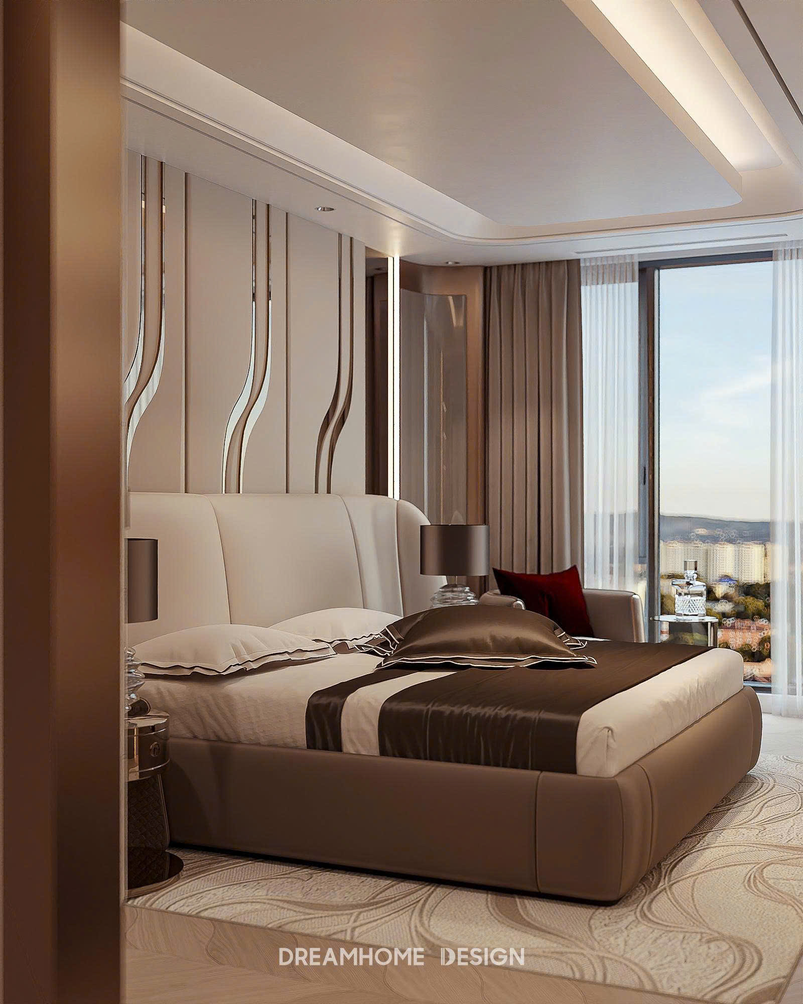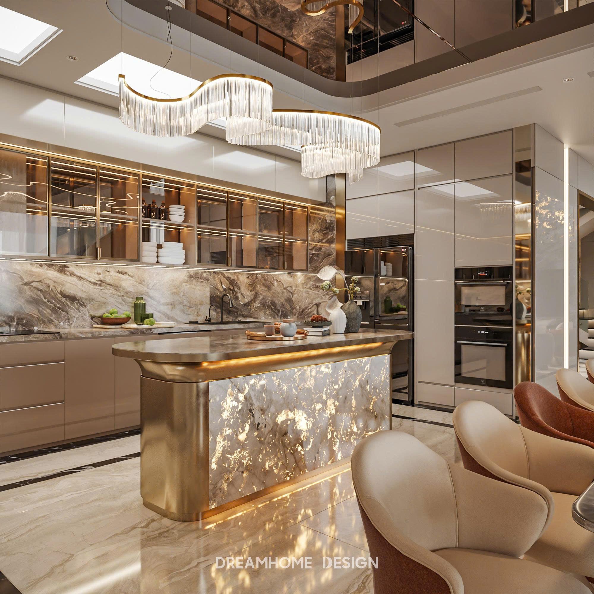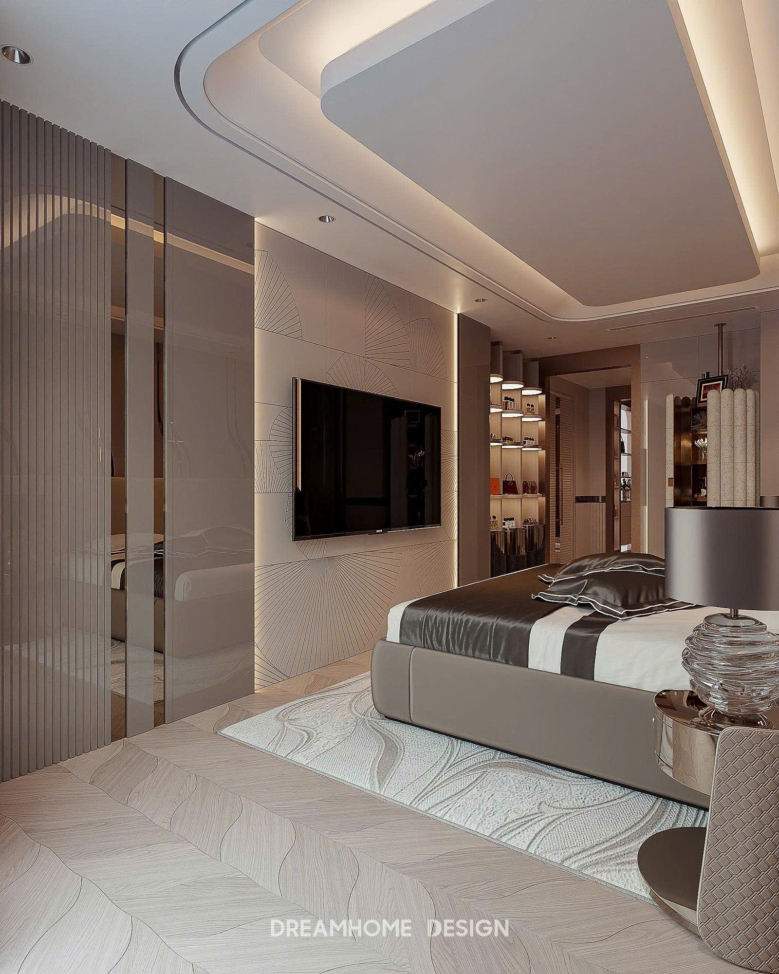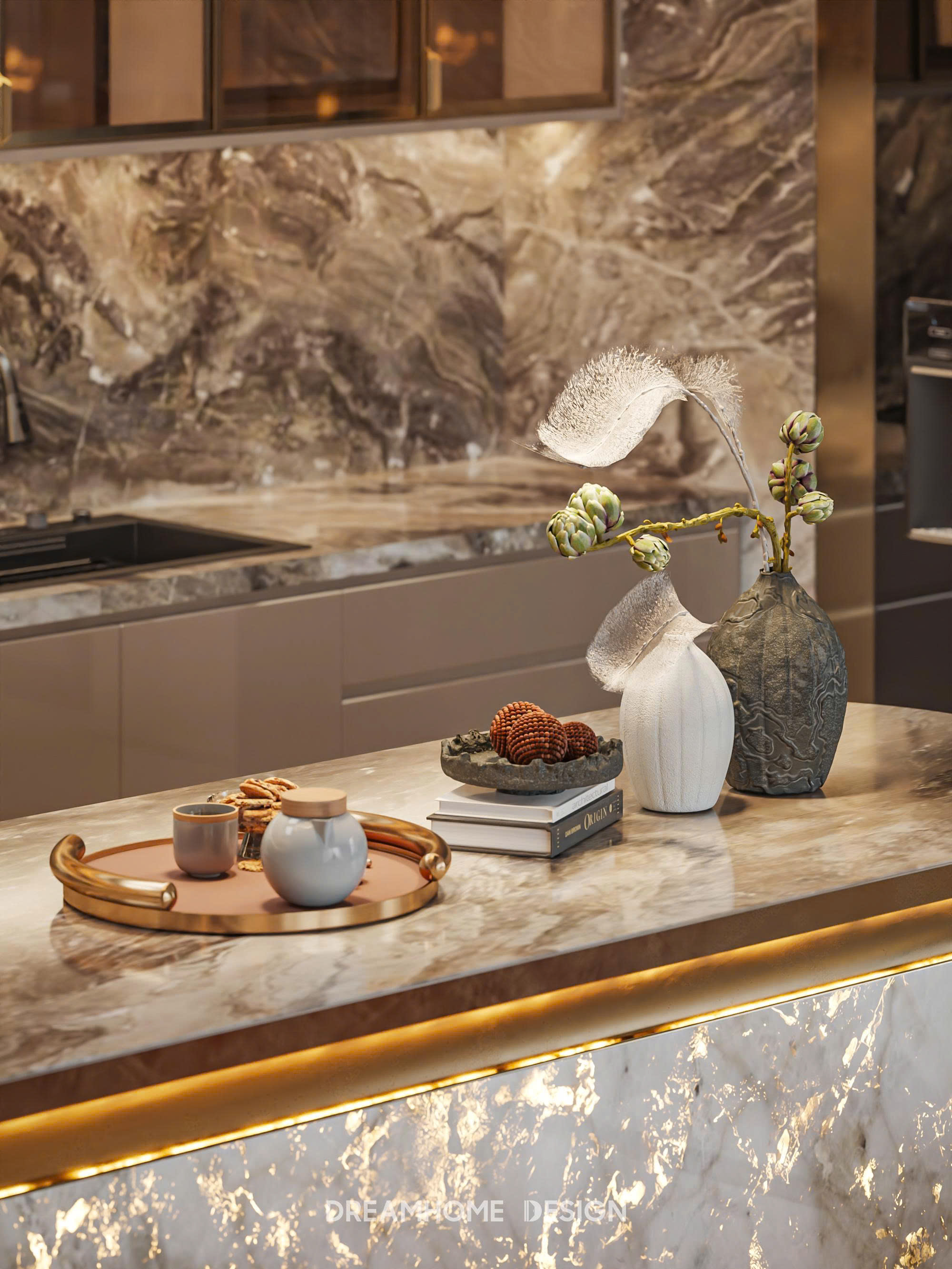 Đá tự nhiên, gỗ veneer, kim loại mạ, kính và da cao cấp là những vật liệu chủ đạo. Sự kết hợp hài hòa giữa bề mặt thô mộc và chi tiết tinh xảo tạo nên chiều sâu cho không gian, đồng thời tôn lên đẳng cấp sống của gia chủ.