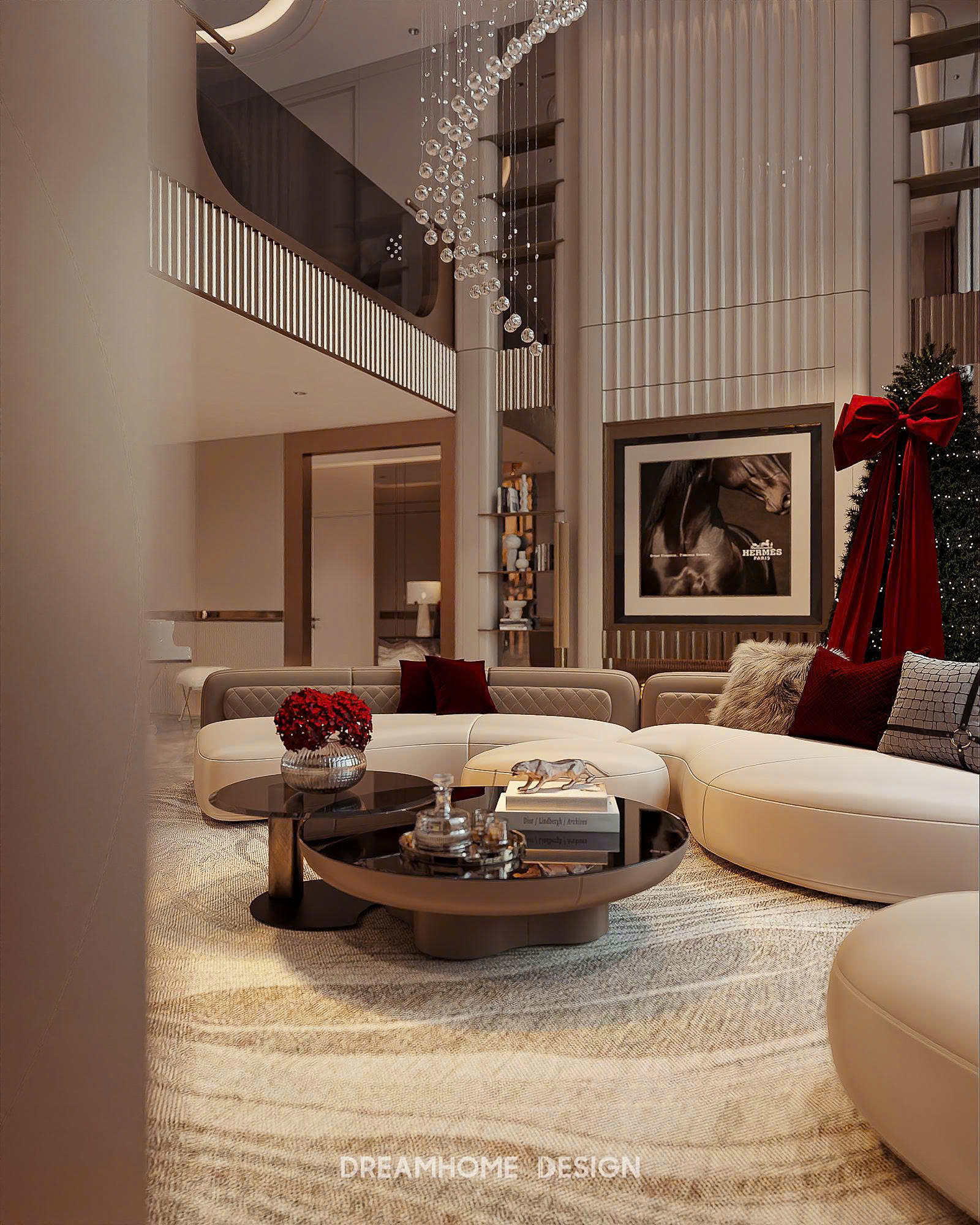 Thiết kế thông tầng tiếp tục là “linh hồn” của căn hộ Duplex. Khu vực phòng khách thường được đặt ở tầng dưới với trần cao, kết hợp đèn chùm nghệ thuật để tạo điểm nhấn thị giác. Ánh sáng tự nhiên được dẫn dắt khéo léo, giúp không gian luôn nhẹ nhàng và sang trọng.