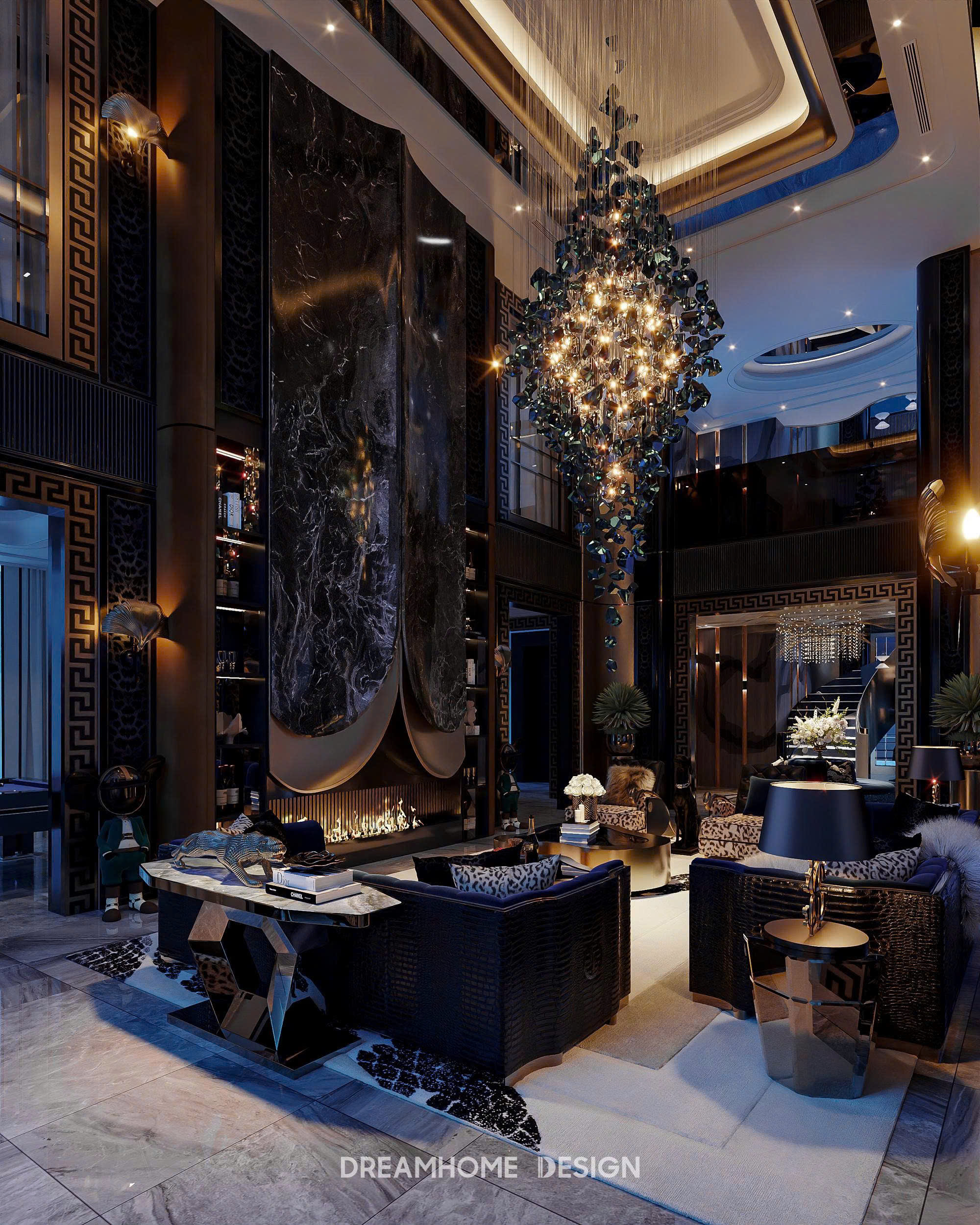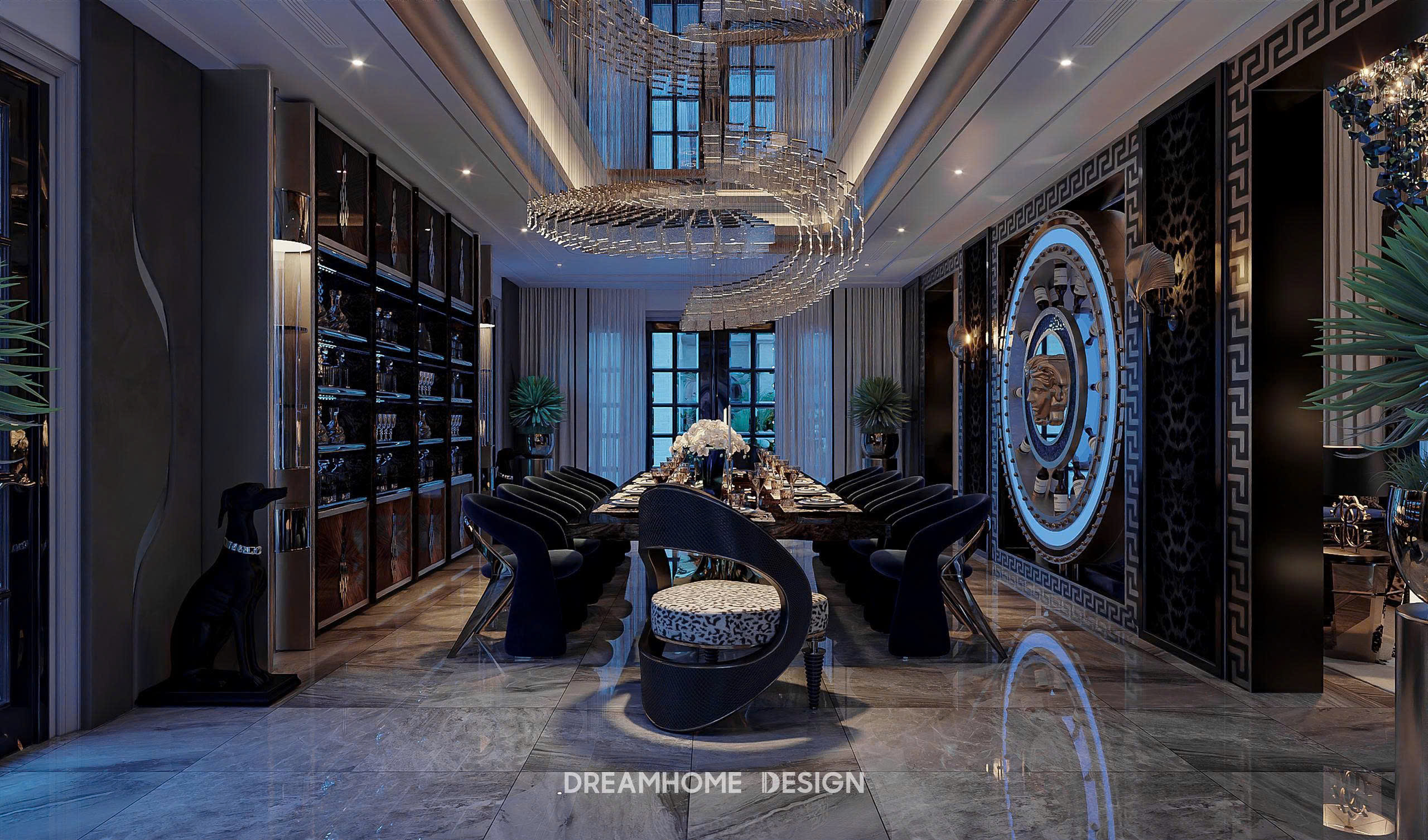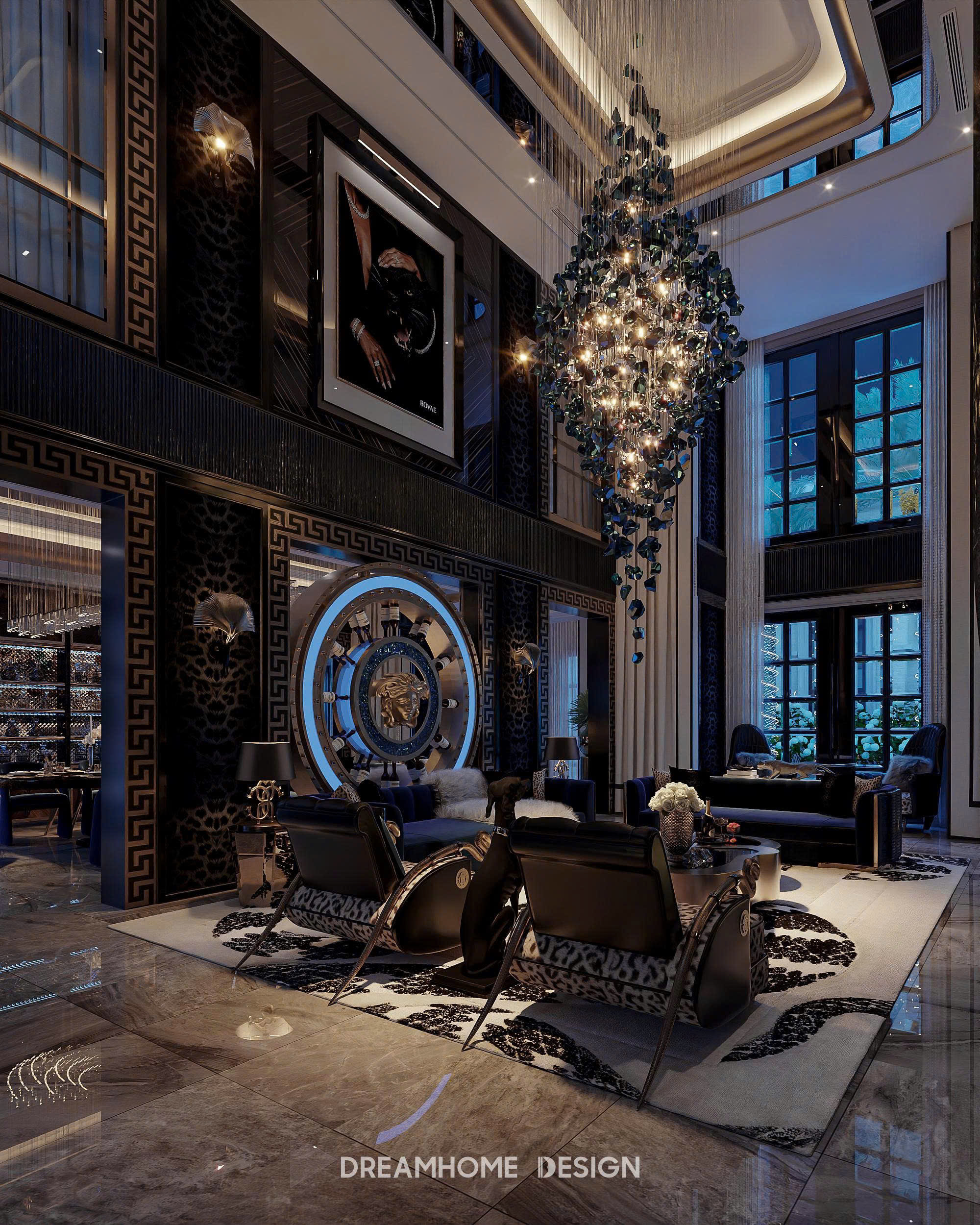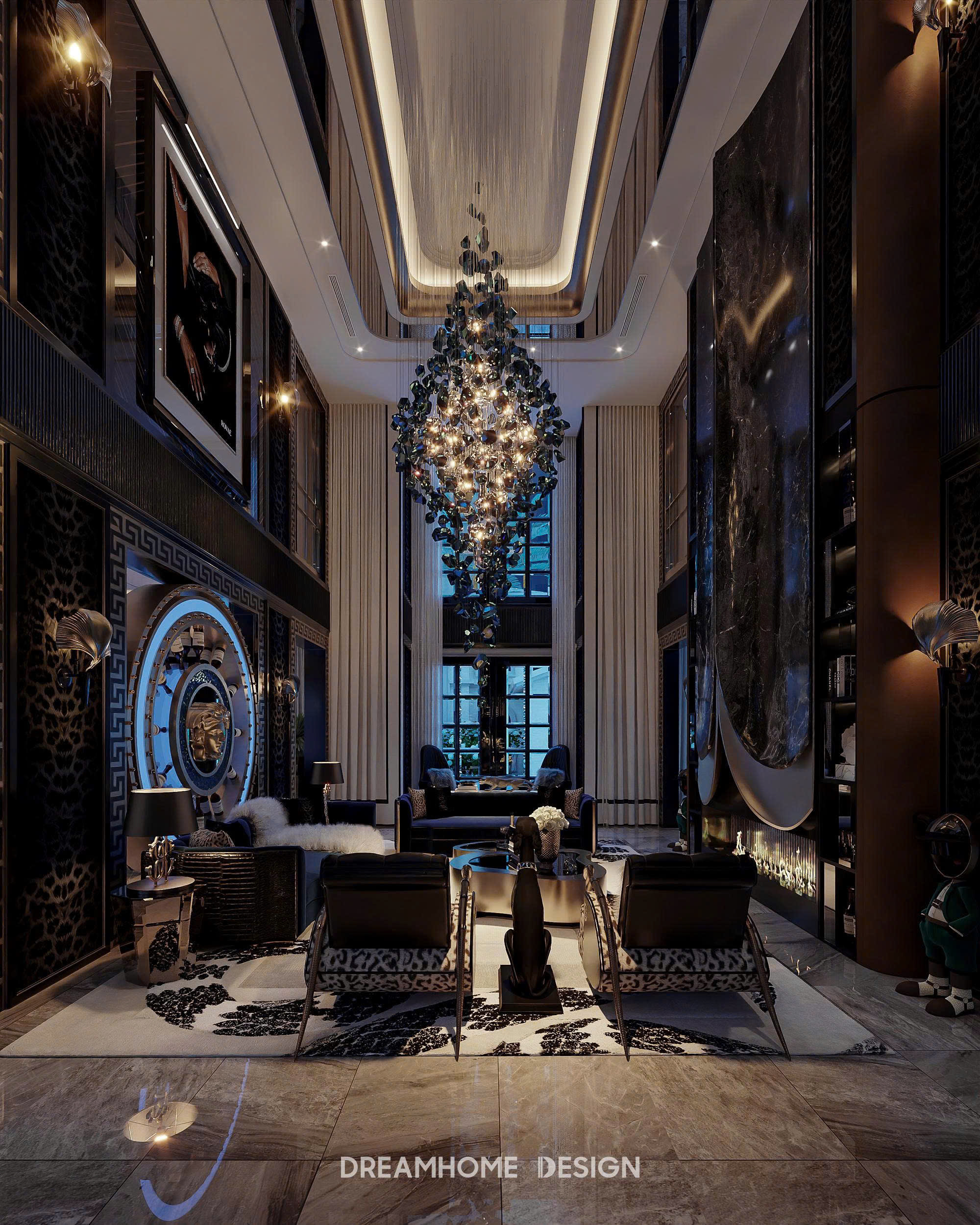 Phong cách Roberto Cavalli trong không gian Hưng Yên Mansion được DreamHome Design thể hiện qua sự hòa quyện giữa chất hoang dã quyến rũ và tinh thần xa hoa Ý. Những họa tiết da thú, đường cong mềm mại cùng sắc ánh kim lấp lánh tạo nên cảm giác quyền lực nhưng vẫn phóng khoáng. Mỗi chi tiết nội thất như kể một câu chuyện về đam mê, bản lĩnh và sự táo bạo – đúng tinh thần Roberto Cavalli, nơi sang trọng không chỉ để ngắm nhìn mà còn để sống trọn trong cảm xúc.