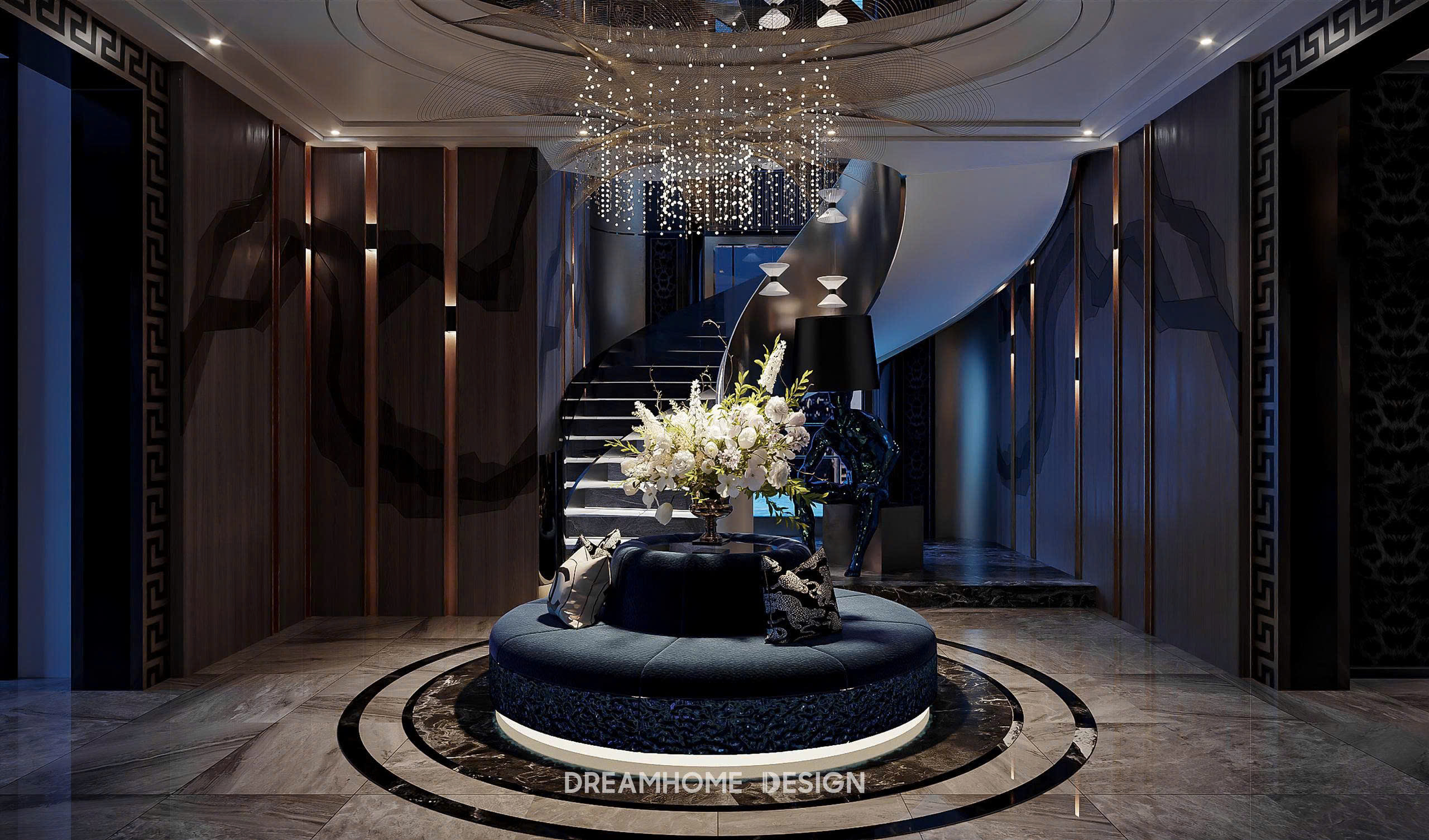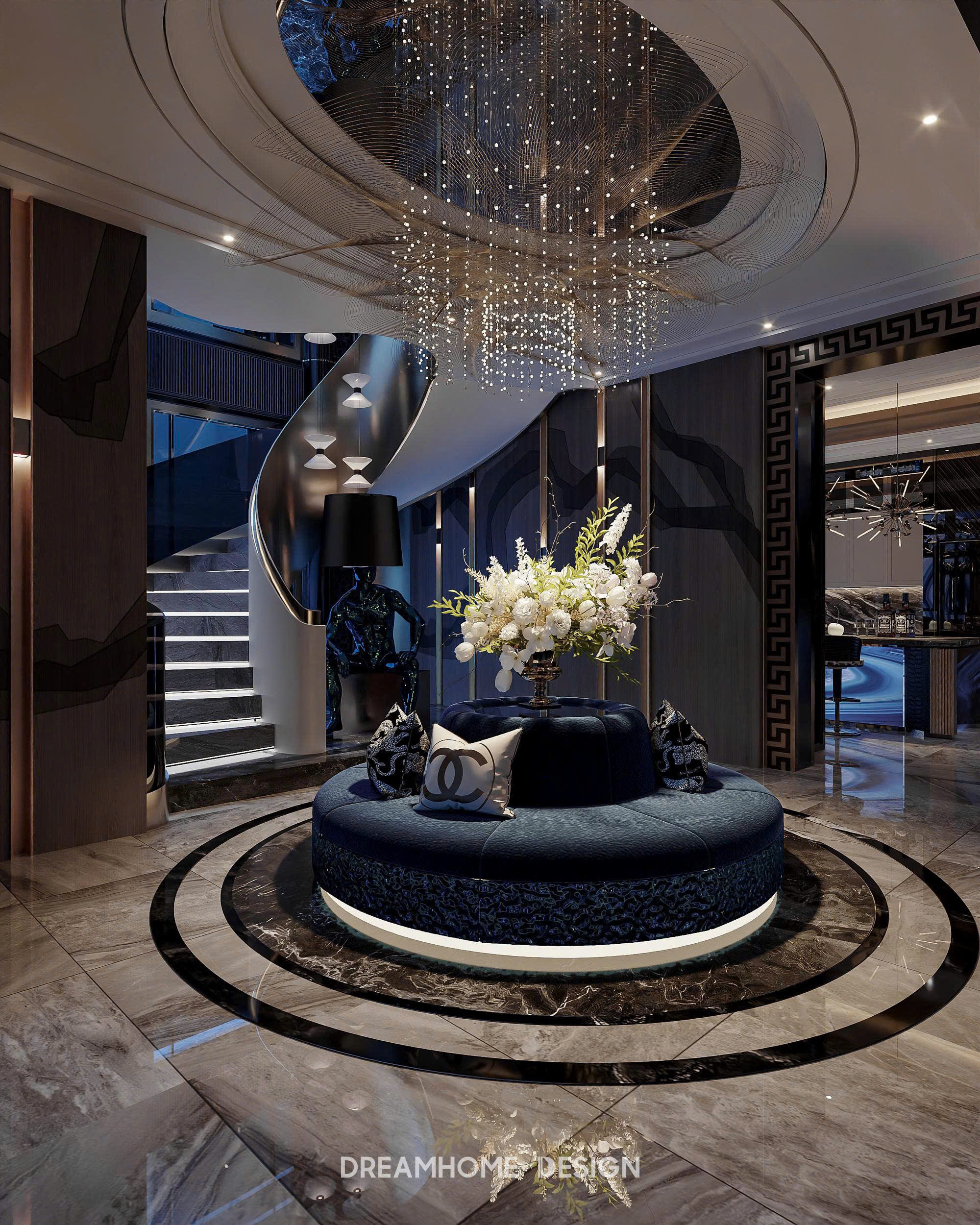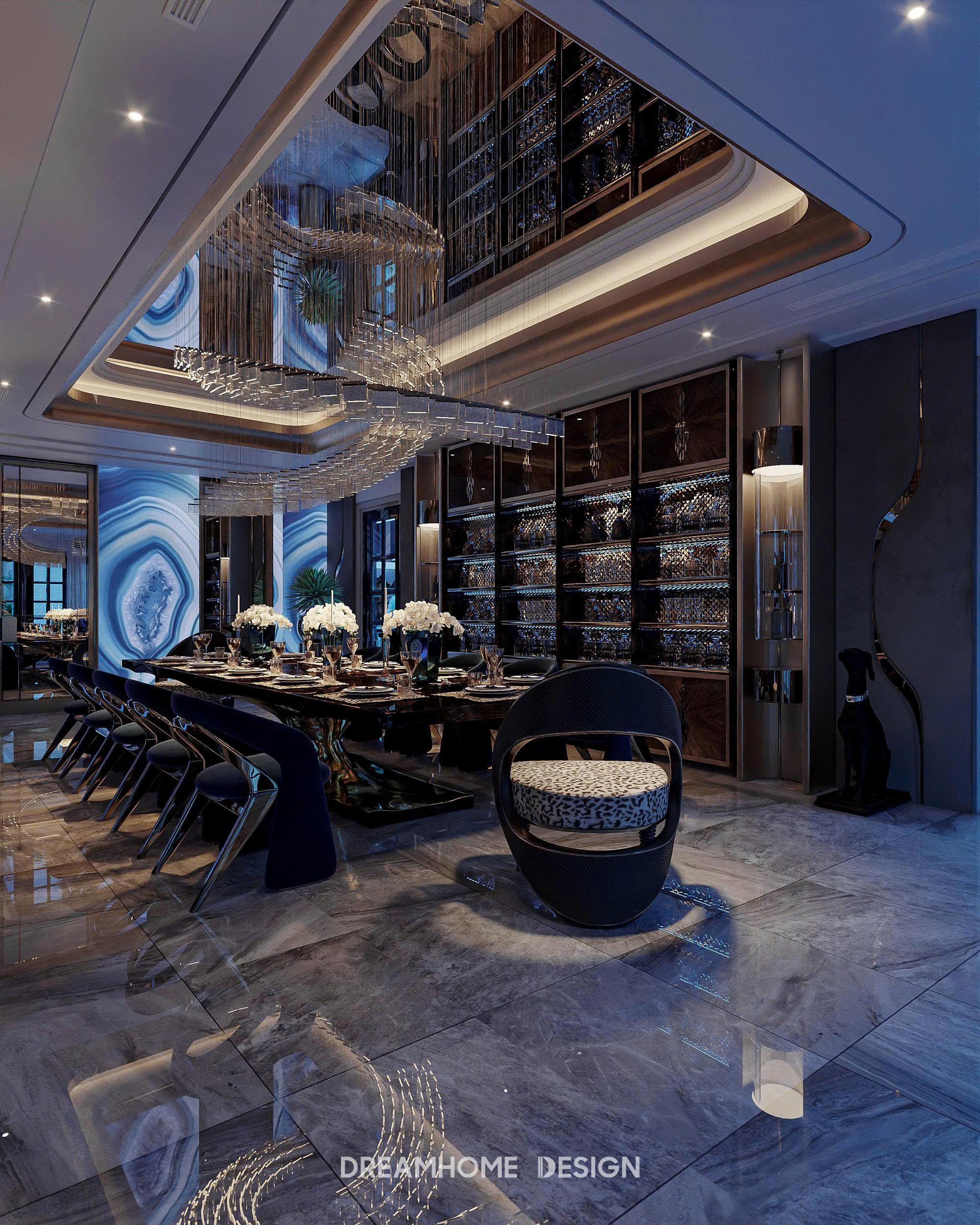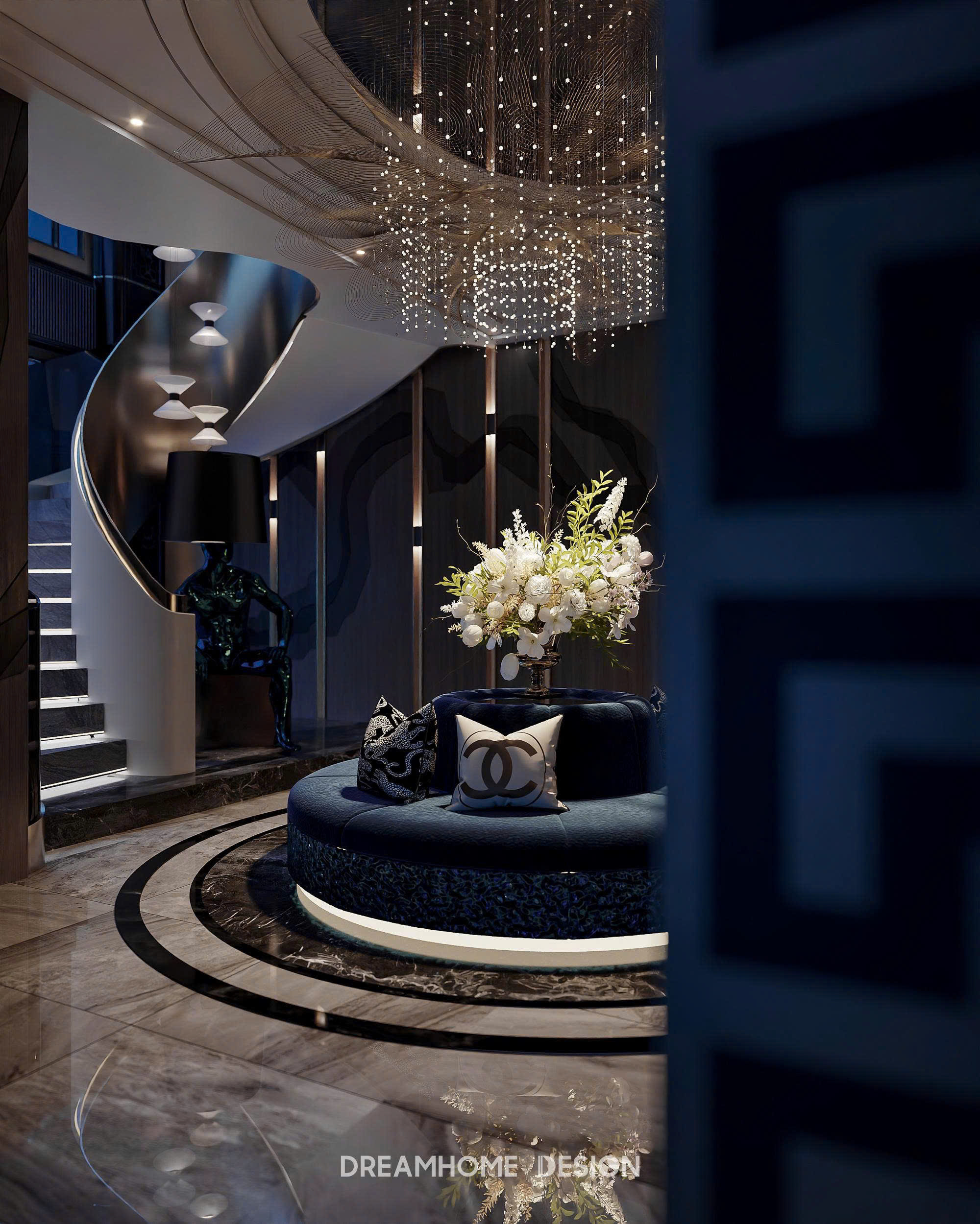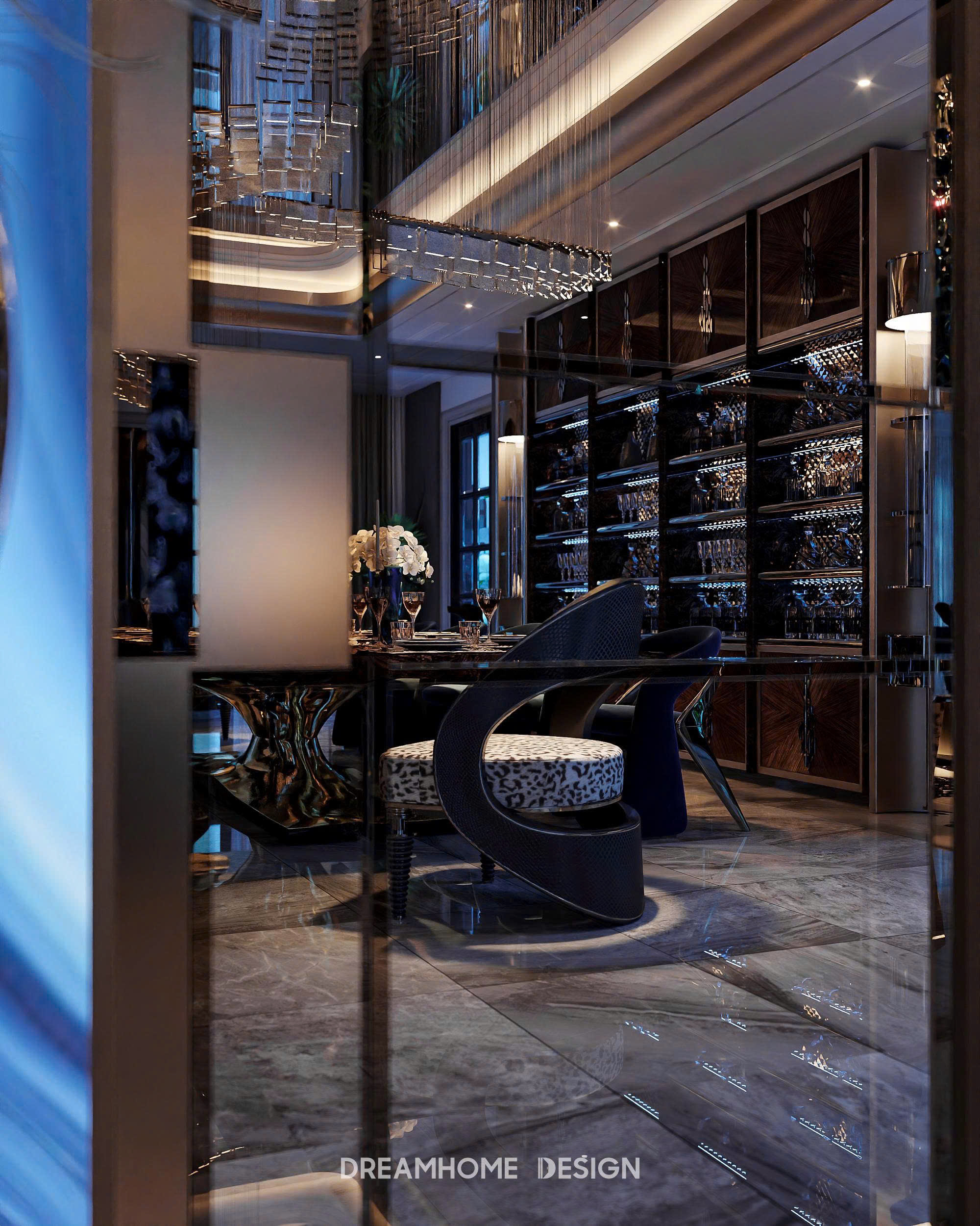 Khoác lên mình gam xanh trầm bí ẩn, không gian Hưng Yên Mansion được DreamHome Design kiến tạo như một tác phẩm nghệ thuật sống, nơi ánh sáng và chất liệu hòa quyện tạo nên bức tranh của sự xa hoa và đẳng cấp. Từng chi tiết, từ mảng tường ốp, đường phào chỉ cho đến món đồ decor nhỏ nhất đều được chọn lọc kỹ lưỡng để thể hiện rõ tinh thần quyền quý của gia chủ.