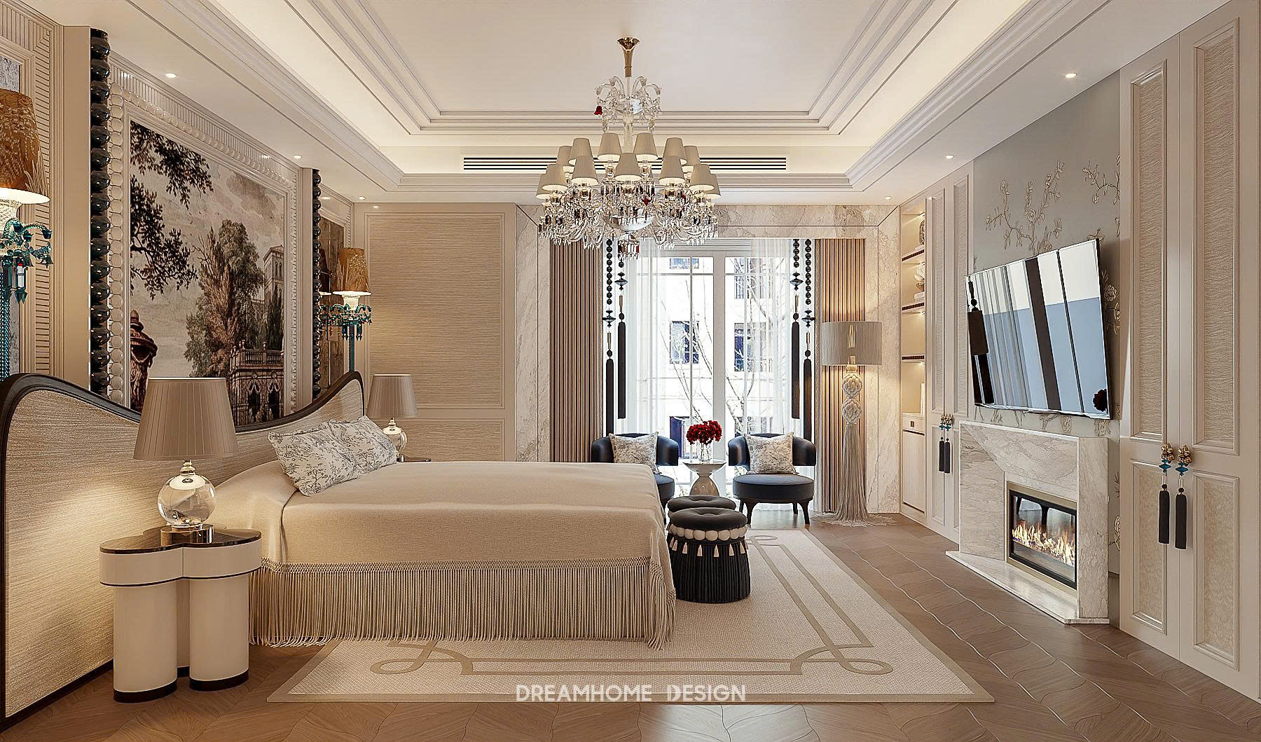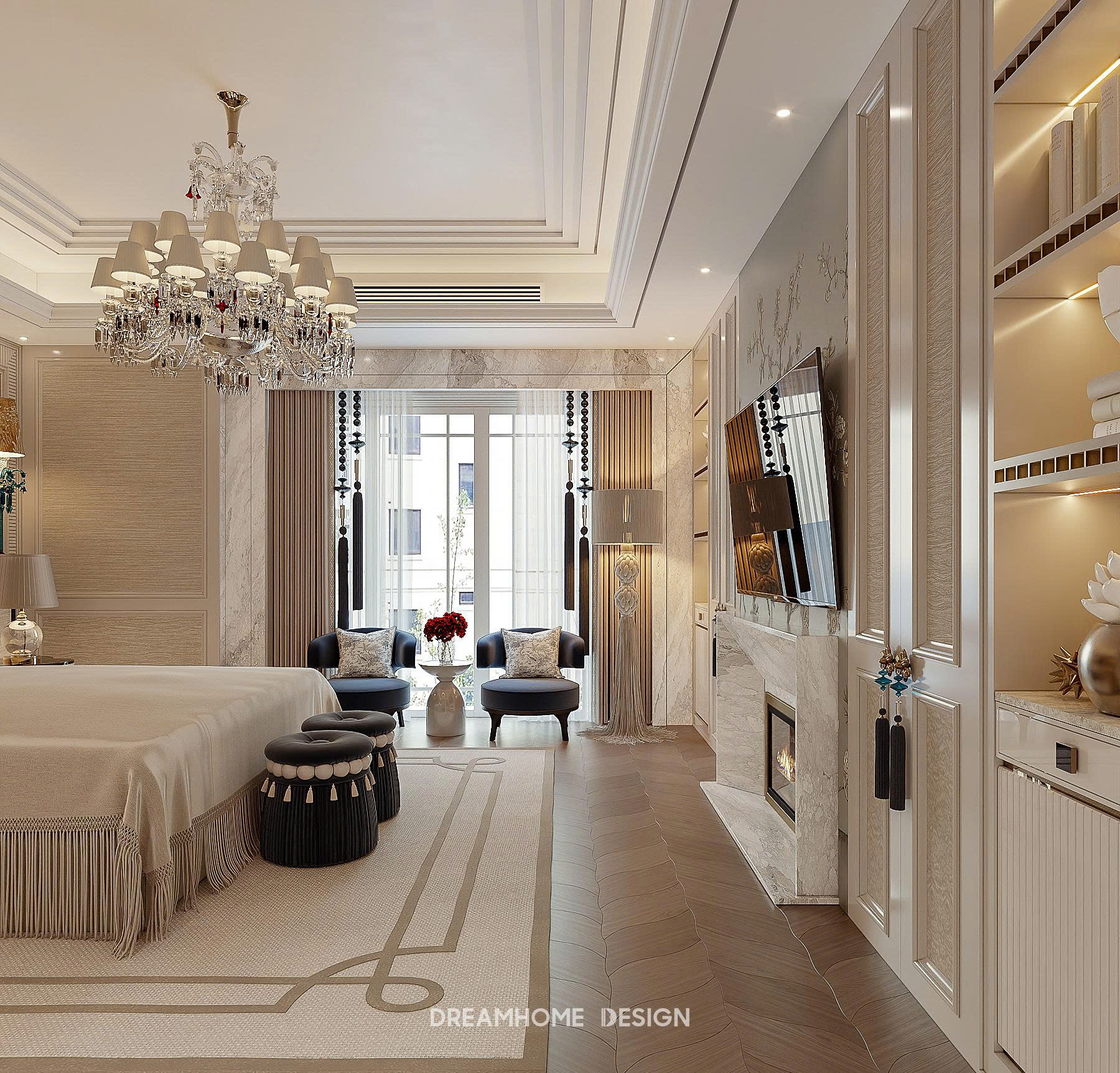 Không gian phòng ngủ Master tại Vinhomes Vũ Yên được kiến tạo như một chốn riêng tư đủ lắng để cơ thể nghỉ ngơi và đủ tinh tế để cảm xúc được nuông chiều. Tinh thần Neo Classic hiện diện qua những đường phào chỉ mềm mại, tỷ lệ cân đối và cách tiết chế chi tiết vừa đủ, tạo nên vẻ đẹp sang trọng nhưng không phô trương.