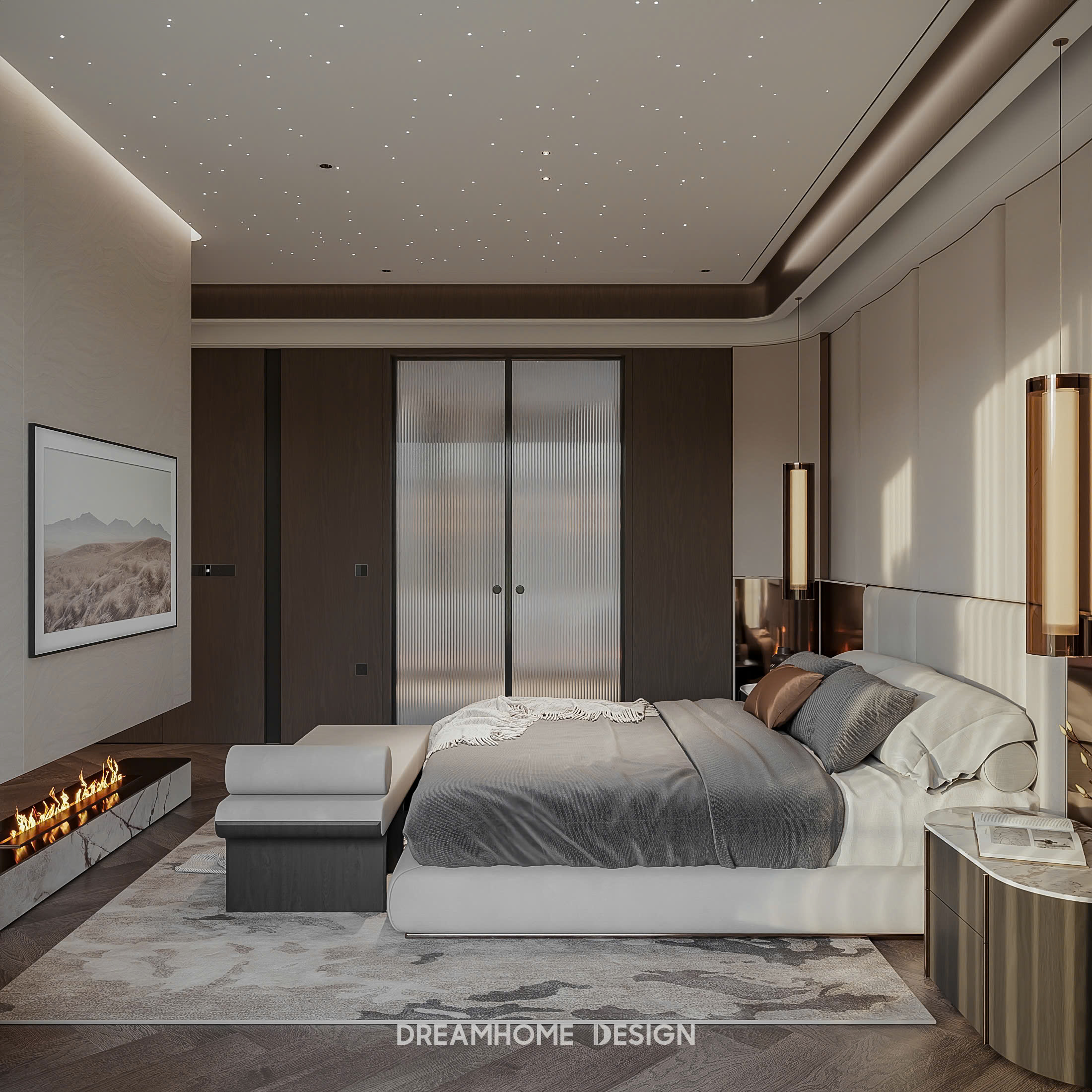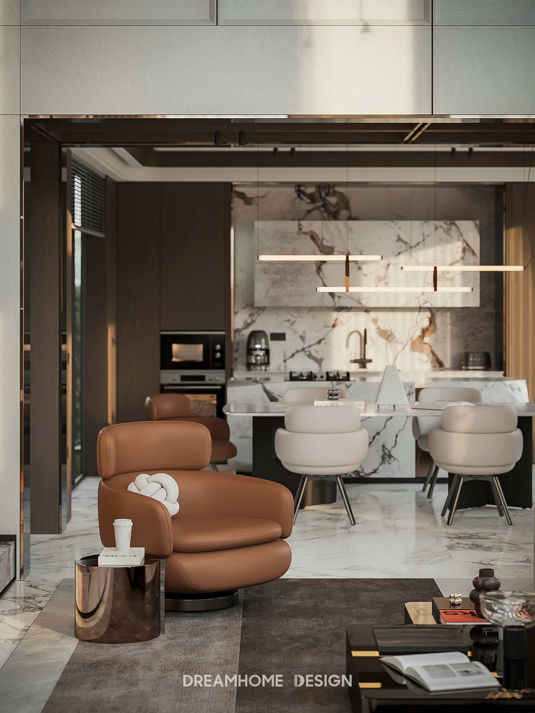 Nội thất hiện đại không phô trương chi tiết, mà tập trung vào chất liệu cao cấp như đá tự nhiên, gỗ veneer, kim loại phủ ánh vàng champagne hay kính cường lực. Ánh sáng tự nhiên được khai thác tối đa thông qua hệ cửa lớn, kết hợp cùng ánh sáng nhân tạo tinh tế, tạo nên một tổng thể nhẹ nhàng nhưng vẫn toát lên vẻ sang trọng bền vững theo thời gian.