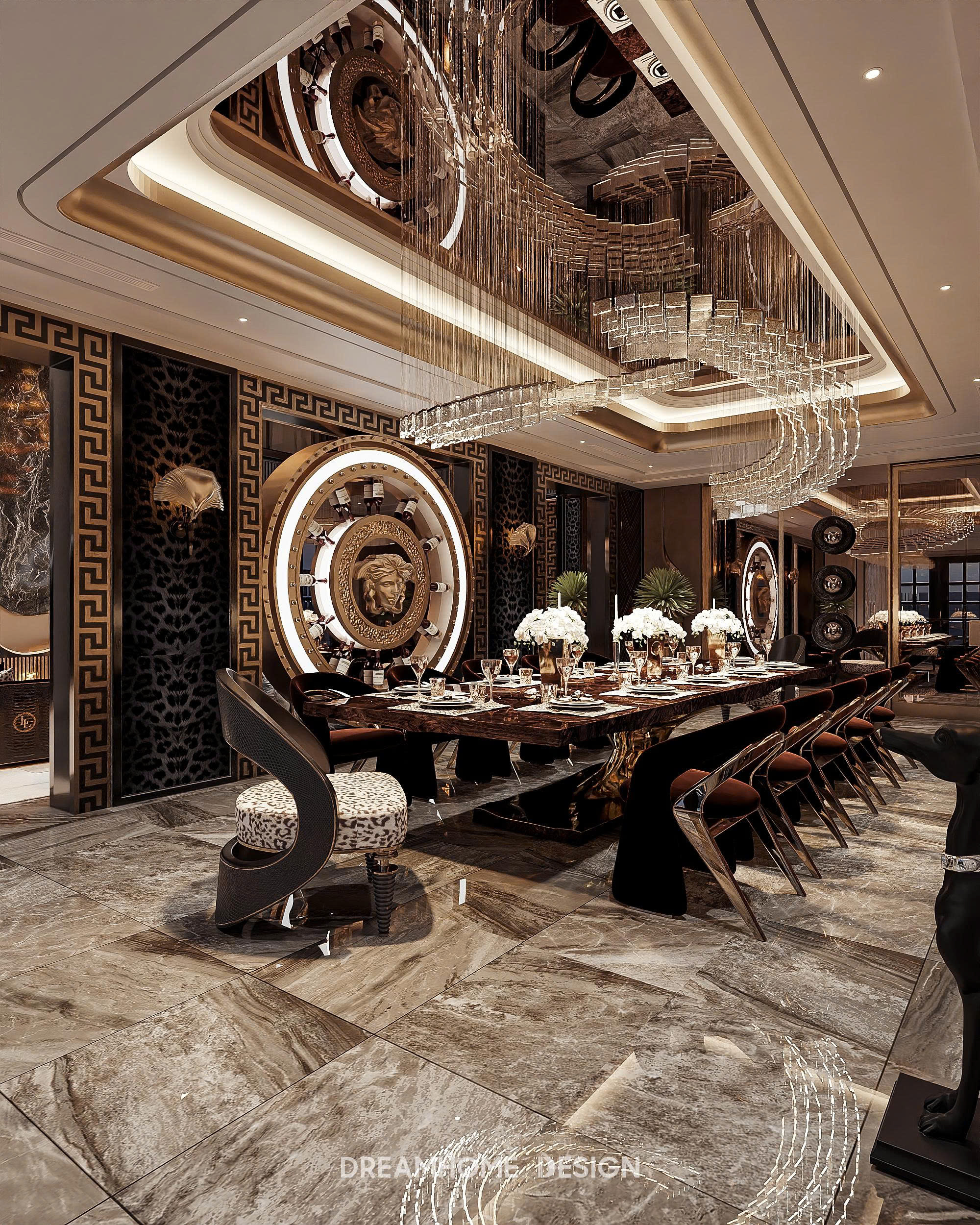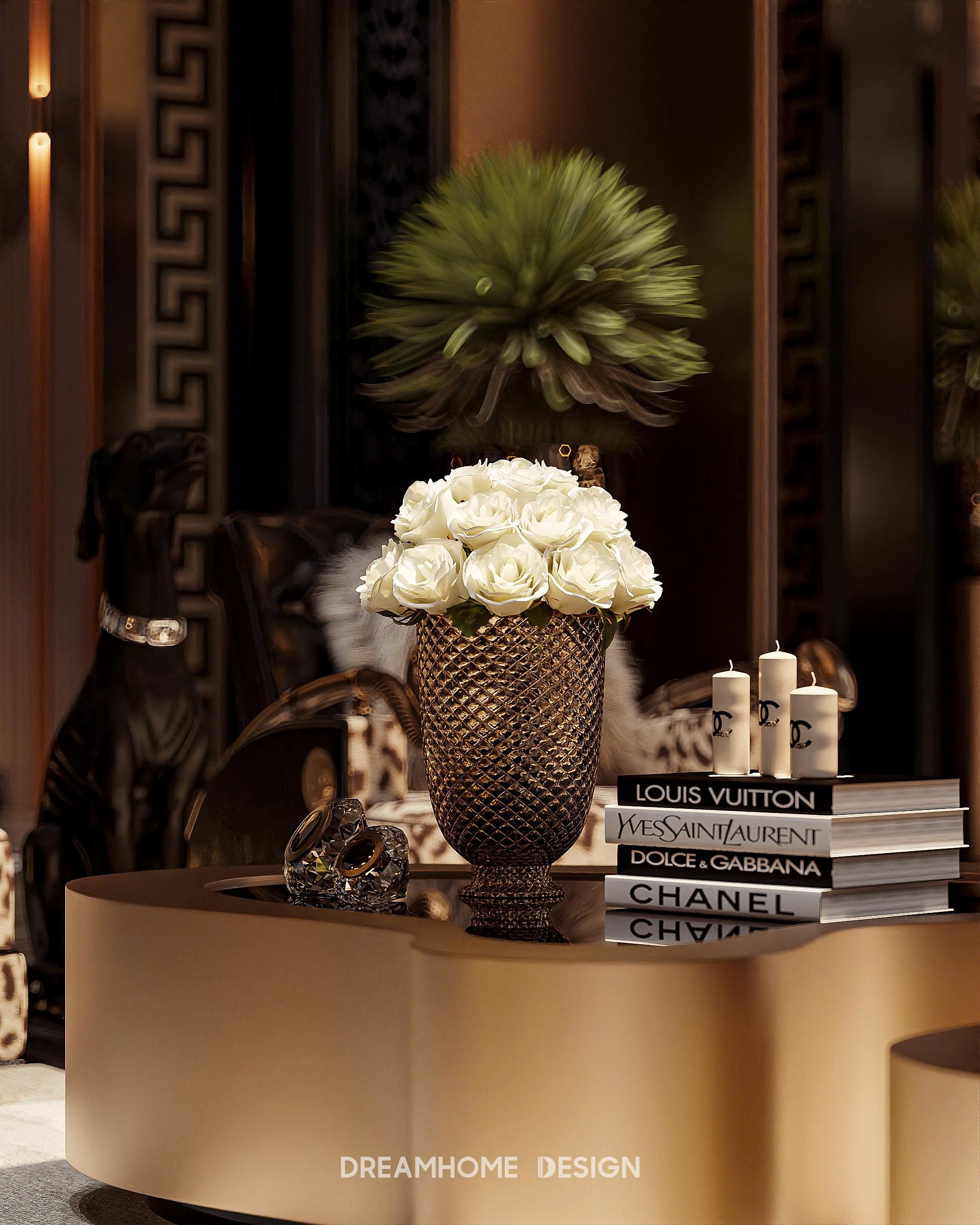 Đặc trưng của Roberto Cavalli nằm ở việc sử dụng vật liệu cao cấp như đá marble vân mạnh, kim loại mạ bóng, da thật, kính màu và các chi tiết ánh kim sang trọng. Đồ nội thất không đơn thuần là vật dụng, mà trở thành tác phẩm nghệ thuật với đường nét táo bạo, phom dáng sắc sảo và bề mặt hoàn thiện tinh xảo. Không gian mang hơi thở thời thượng, quyến rũ và đầy cá tính – đúng tinh thần sống của giới tinh hoa.