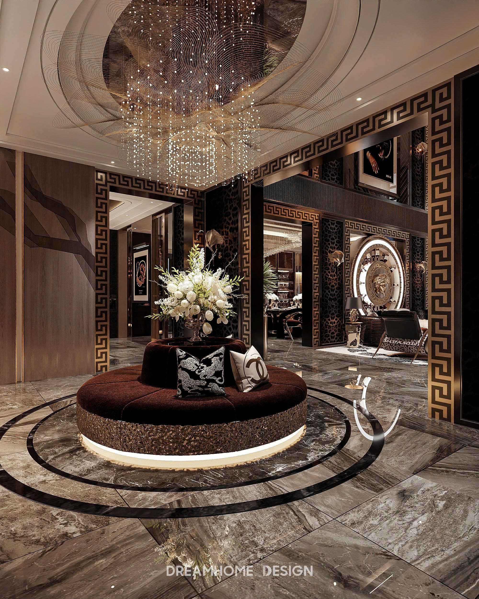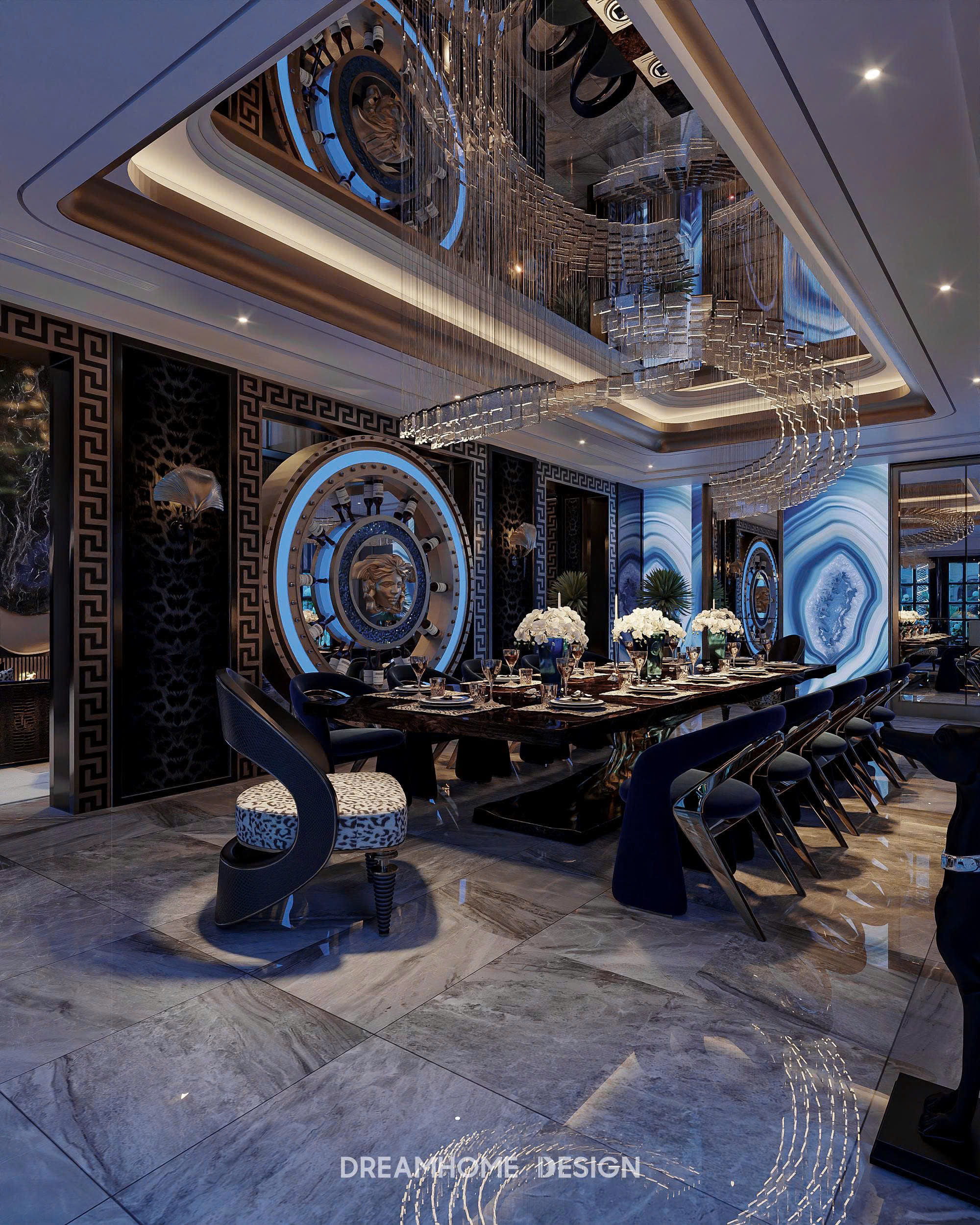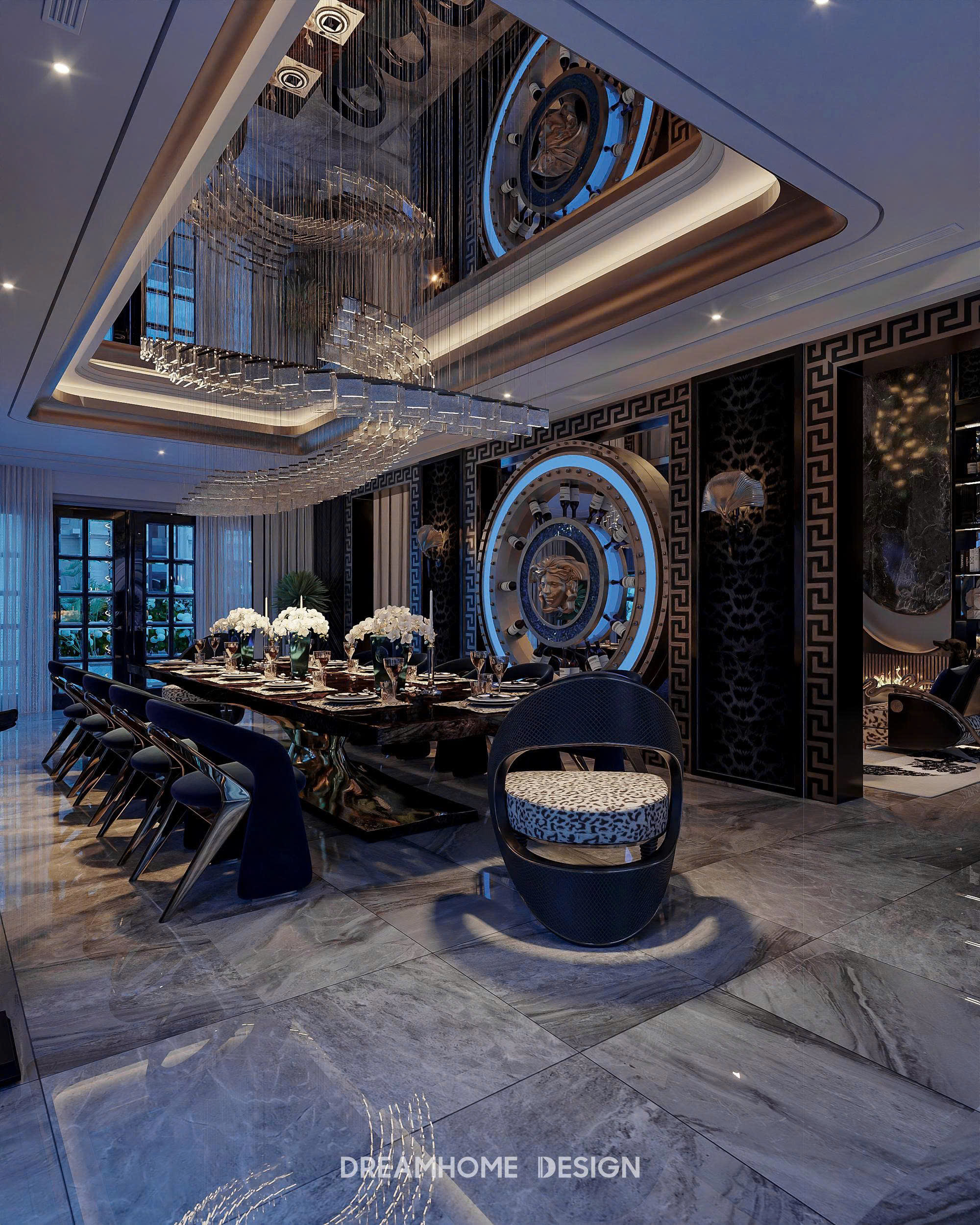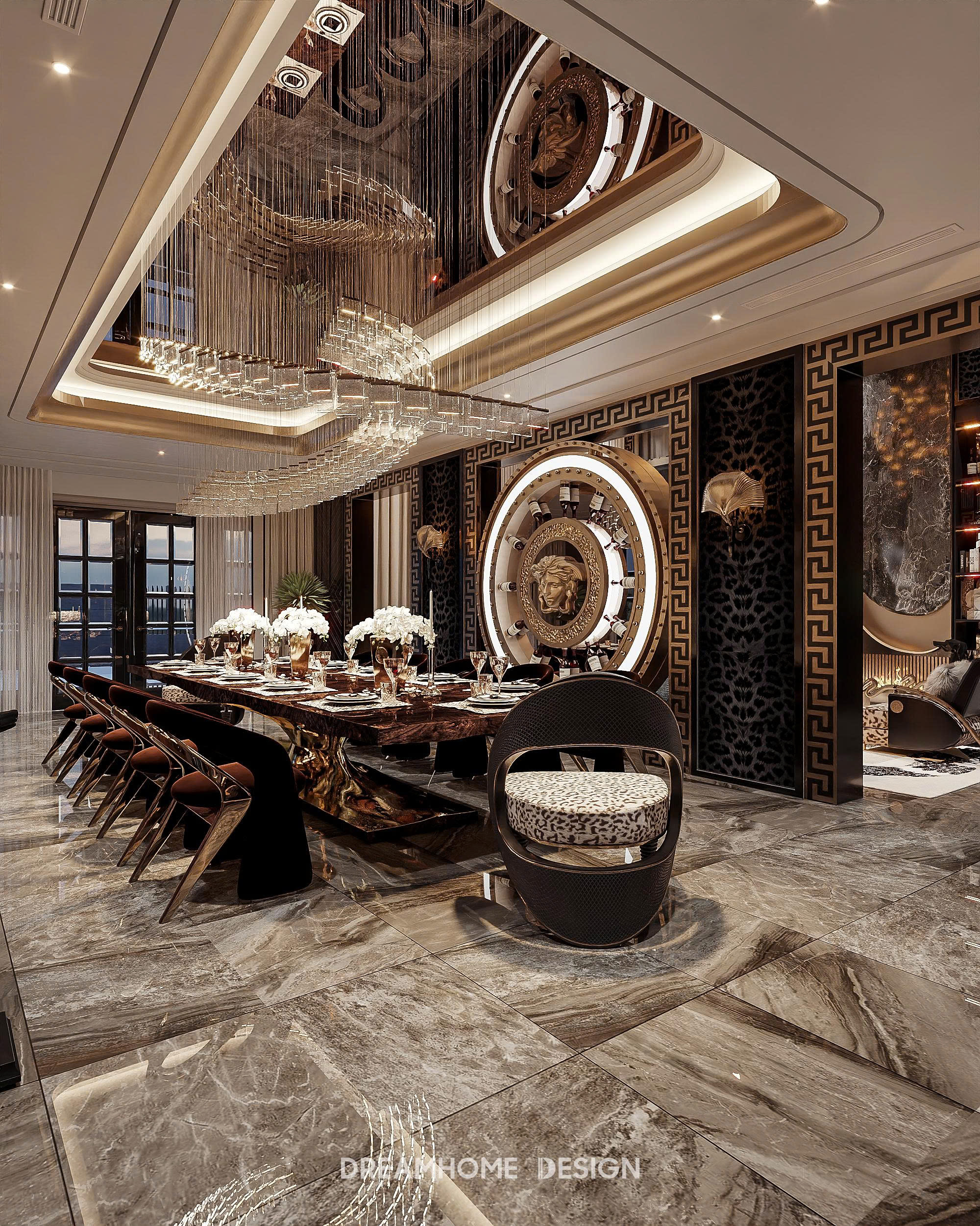 Điểm nhận diện nổi bật của phong cách Roberto Cavalli nằm ở sự kết hợp đầy nghệ thuật giữa vật liệu cao cấp và ngôn ngữ thiết kế gợi cảm. Đá marble vân mạnh, kim loại ánh vàng, da cao cấp, nhung, lụa… được sử dụng có chủ đích để tạo nên chiều sâu thị giác và cảm giác chạm sang trọng. Những bề mặt bóng, phản chiếu ánh sáng không chỉ tôn lên vẻ xa xỉ mà còn khiến không gian luôn sống động, lôi cuốn ở mọi góc nhìn.