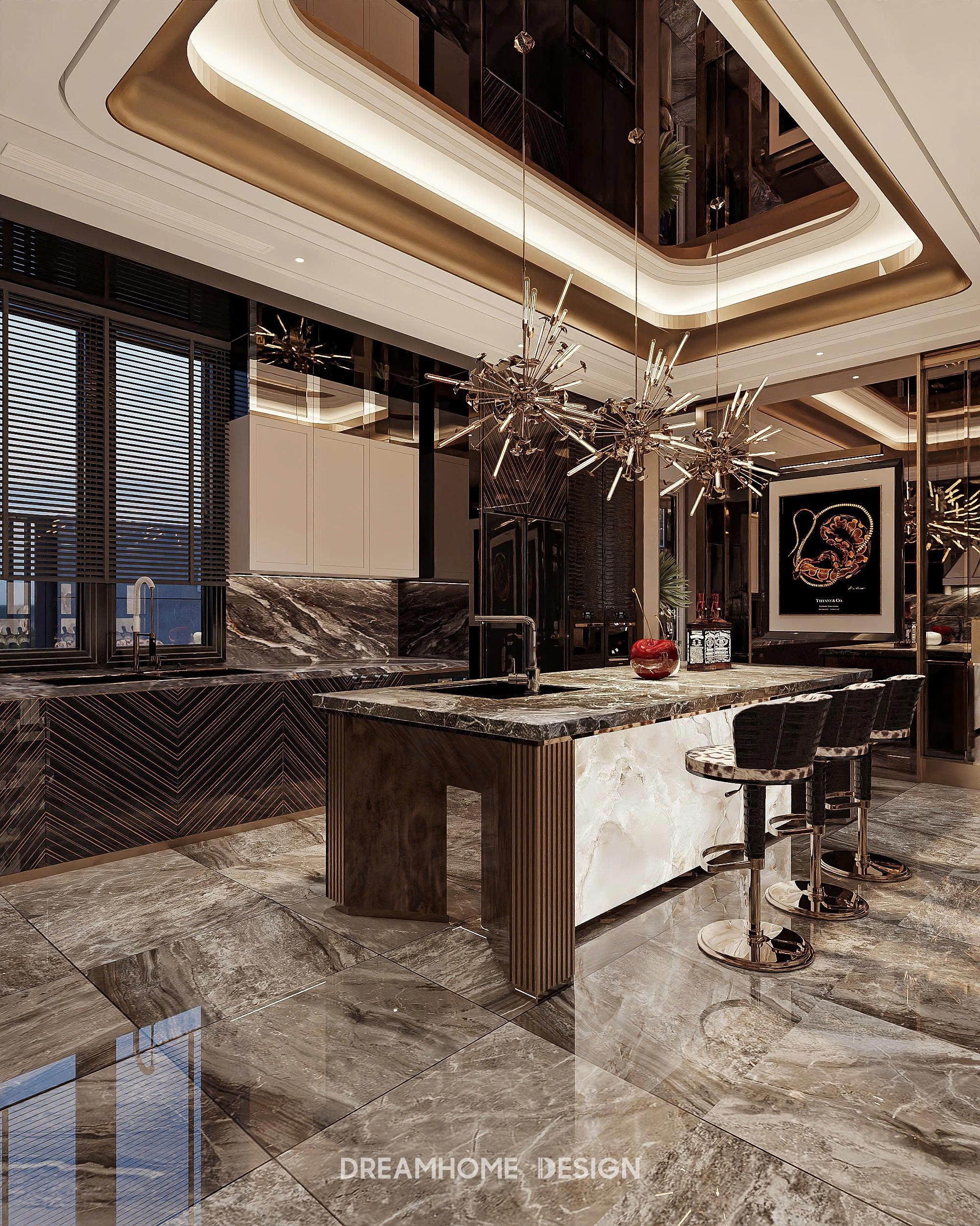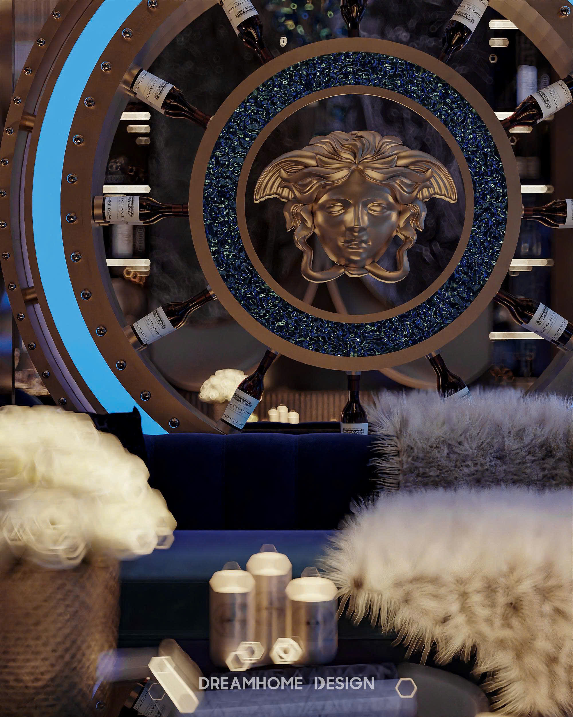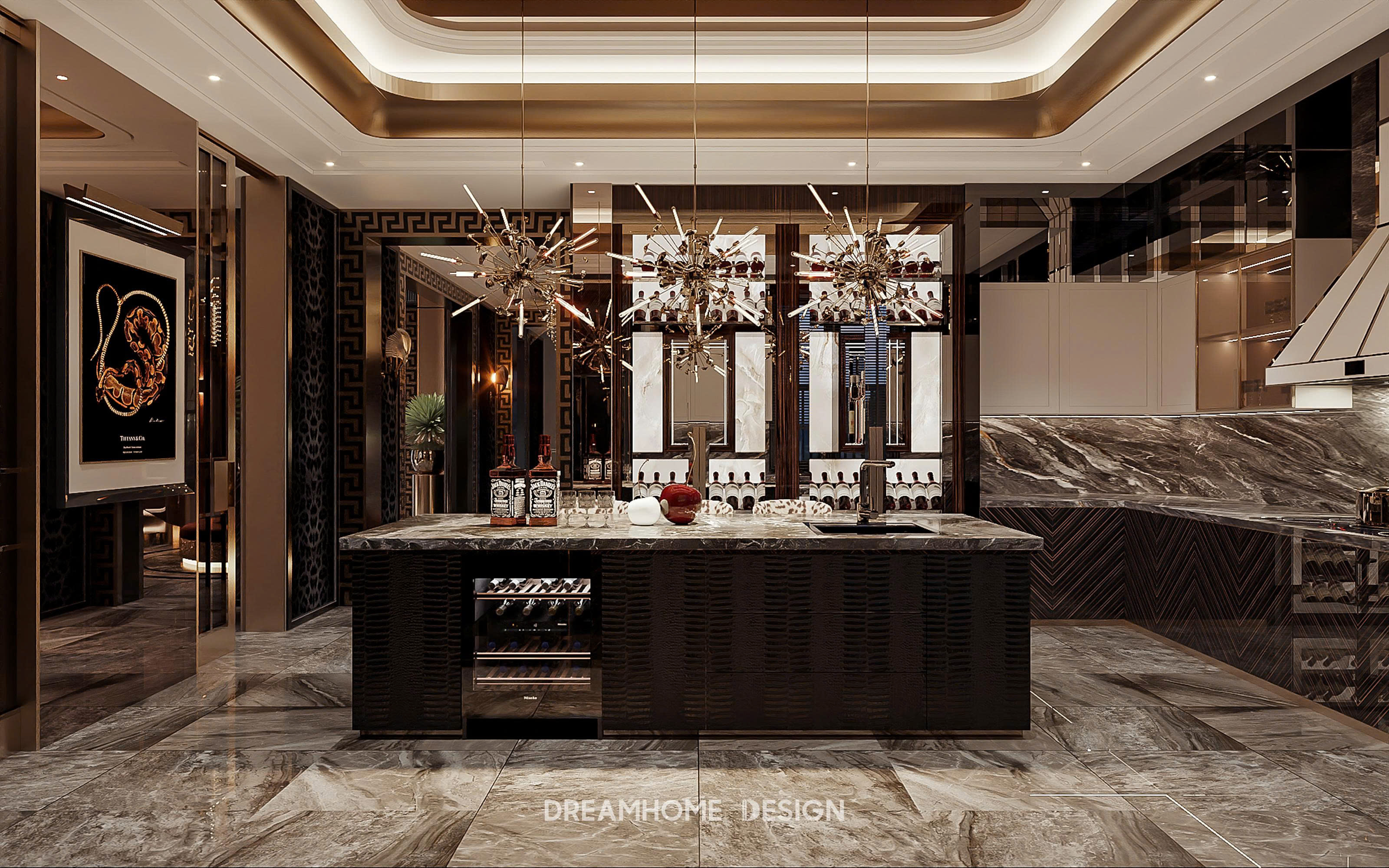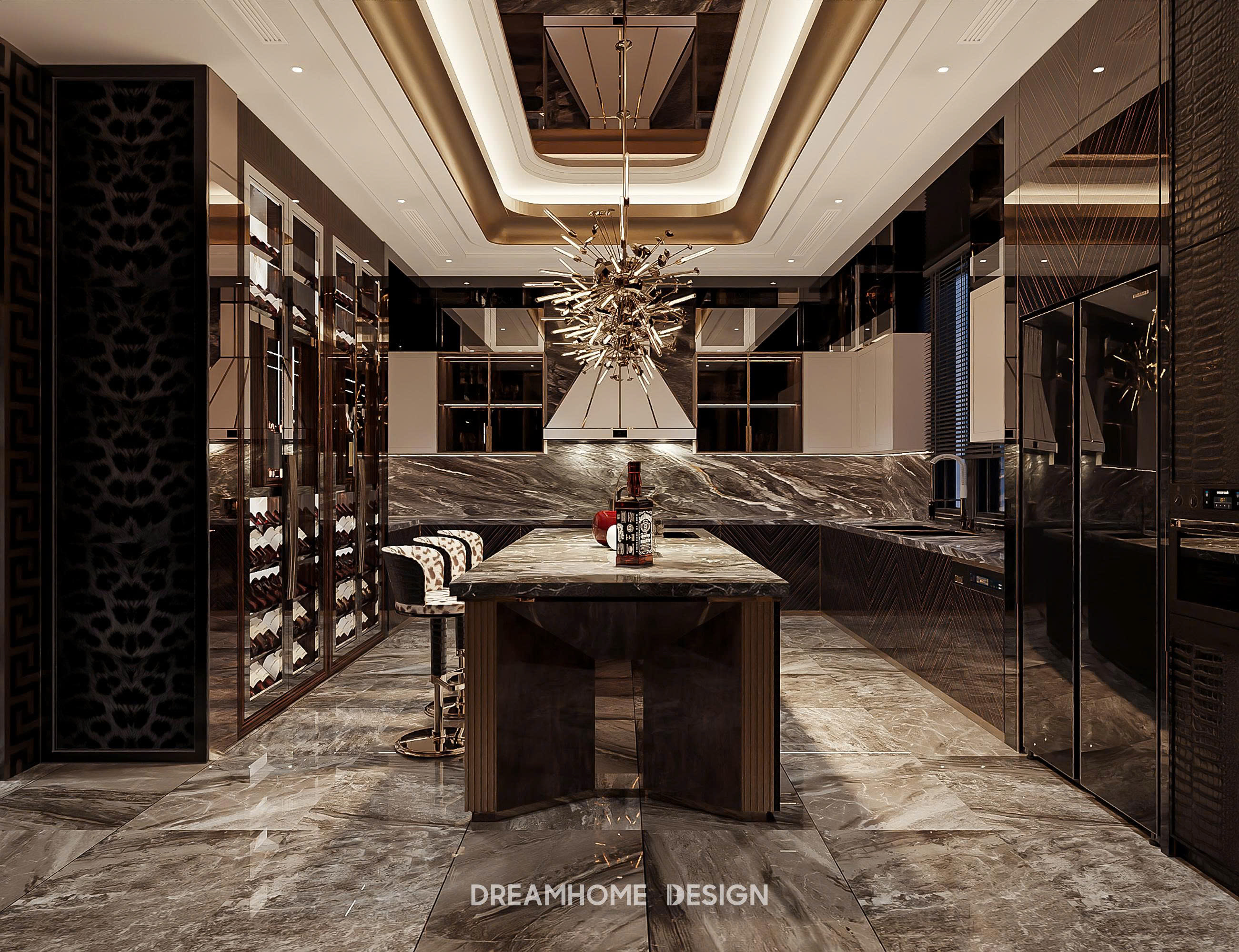 Điểm nhận diện nổi bật của phong cách Roberto Cavalli nằm ở sự kết hợp đầy nghệ thuật giữa vật liệu cao cấp và ngôn ngữ thiết kế gợi cảm. Đá marble vân mạnh, kim loại ánh vàng, da cao cấp, nhung, lụa… được sử dụng có chủ đích để tạo nên chiều sâu thị giác và cảm giác chạm sang trọng. Những bề mặt bóng, phản chiếu ánh sáng không chỉ tôn lên vẻ xa xỉ mà còn khiến không gian luôn sống động, lôi cuốn ở mọi góc nhìn.