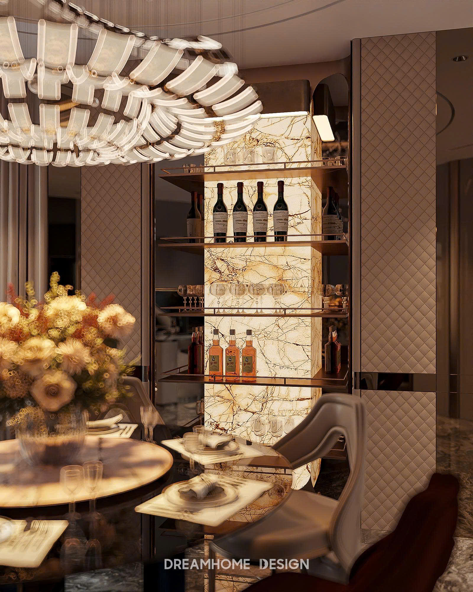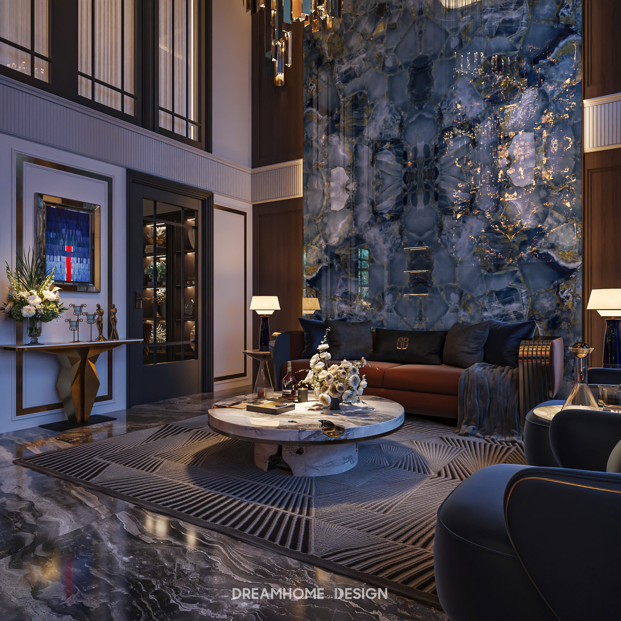 Khi đêm xuống, ánh sáng nhân tạo được tiết chế vừa đủ, tập trung vào những điểm nhấn như mảng tường, bề mặt đá, hệ kệ trưng bày hay khu vực sinh hoạt chung. Sự chuyển đổi nhẹ nhàng giữa các lớp ánh sáng tạo nên chiều sâu, khiến không gian trở nên ấm áp, sang trọng và đầy chất sống.